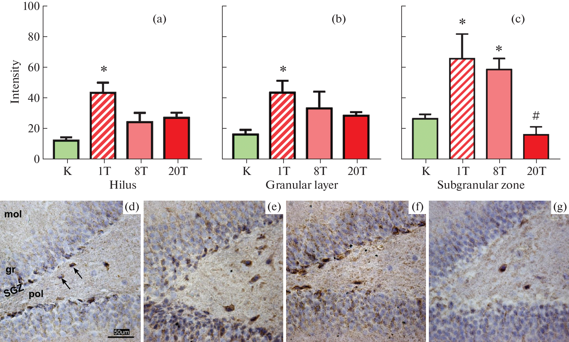 One of the most vulnerable brain structures to hypoxia is the hippocampus. Maintenance of the neurogenic niche cell pool in the subgranular zone of the hippocampus (SGZ) is provided by adaptive mechanisms. Among them are changes in the functional activity of mitochondrial respiratory chain complexes and the reaction of astroglia, which provides metabolic support for neurons. In order to study the dynamics of adaptive changes in neurons and glia in the dentate gyrus of the hippocampus under hypoxic conditions on a model of intermitten hypobaric hypoxia (5000 m, equivalent to 10.5% O2), with a single (60 min) and multiple (8 and 20 episodes) exposure in low-resistant rats, immunomorphological methods revealed the features of localization and content in the neurons of complex IV mitochondrial respiratory chain (MTCO1), astrocyte marker proteins glutamine synthetase (GS) and GFAP, and doublecortin (DCX) in immature neurons. With a single hypoxia, the content of MTCO1 in neurons significantly increased, and after eight exposures, the amount of glutamine synthetase (GS) in astrocytes of the dentate gyrus of the hippocampus increased. Changes in the content of GS were most pronounced in the processes of astrocytes, which indicates a redistribution of GS. The number of DCX+ neurons in the SGZ significantly decreased after 20 episodes of hypoxia. At the same time, DCX+ cells of glial morphology were found in the polymorphic layer, and staining for GFAP showed an increase in the number of astrocytes. This may be due to a shift in the direction of cell differentiation in the neurogenic niche. Thus, in hypoxia, at the initial stage, a functional restructuring of the respiratory chain of neurons of the granular layer occurs. Subsequently, it is noted by the activation of astrocytes that modulate glutamate metabolism. The presence of a relationship between the dynamics of adaptive reactions of energy exchange in neurons and glia and changes in neurogenesis during 20 episodes of hypoxia suggests that during long-term hypoxia, the differentiation of neural precursors of SGZ in the direction of astroglia occurs, however, this issue requires further study in order to more accurately determine the nature of DCX+ cells.