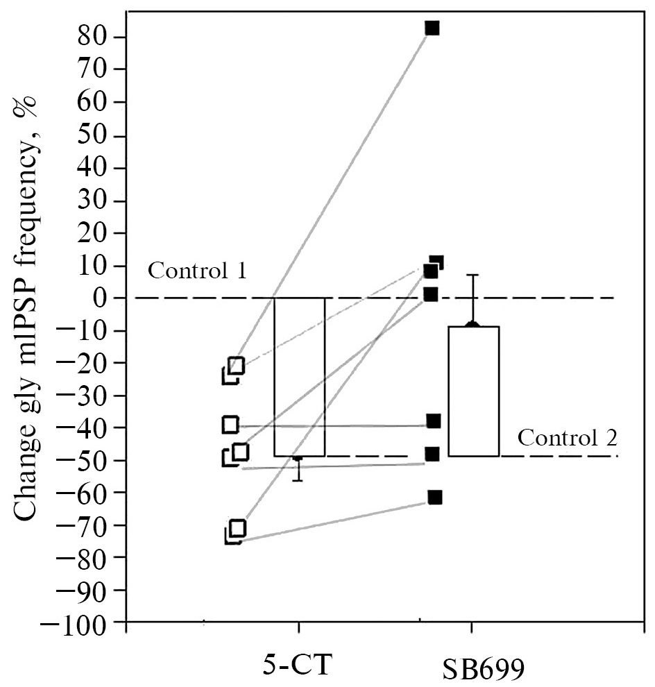 Рис. 5. Гистограммы, представляющие действие лигандов серотониновых рецепторов на частоту или мТПСП (Контроль 1) семи мотонейронов. Агонист 5-HTрецепторов 5-СТ в концентрации (1 мкМ) уменьшает частоту в среднем на –48.6 + 8.0% (Контроль 2), антагонист 5-HT5A рецепторов SВ‑699551 восстанавливает частоту событий в среднем на 41.0 + 16.4% (m + SE).