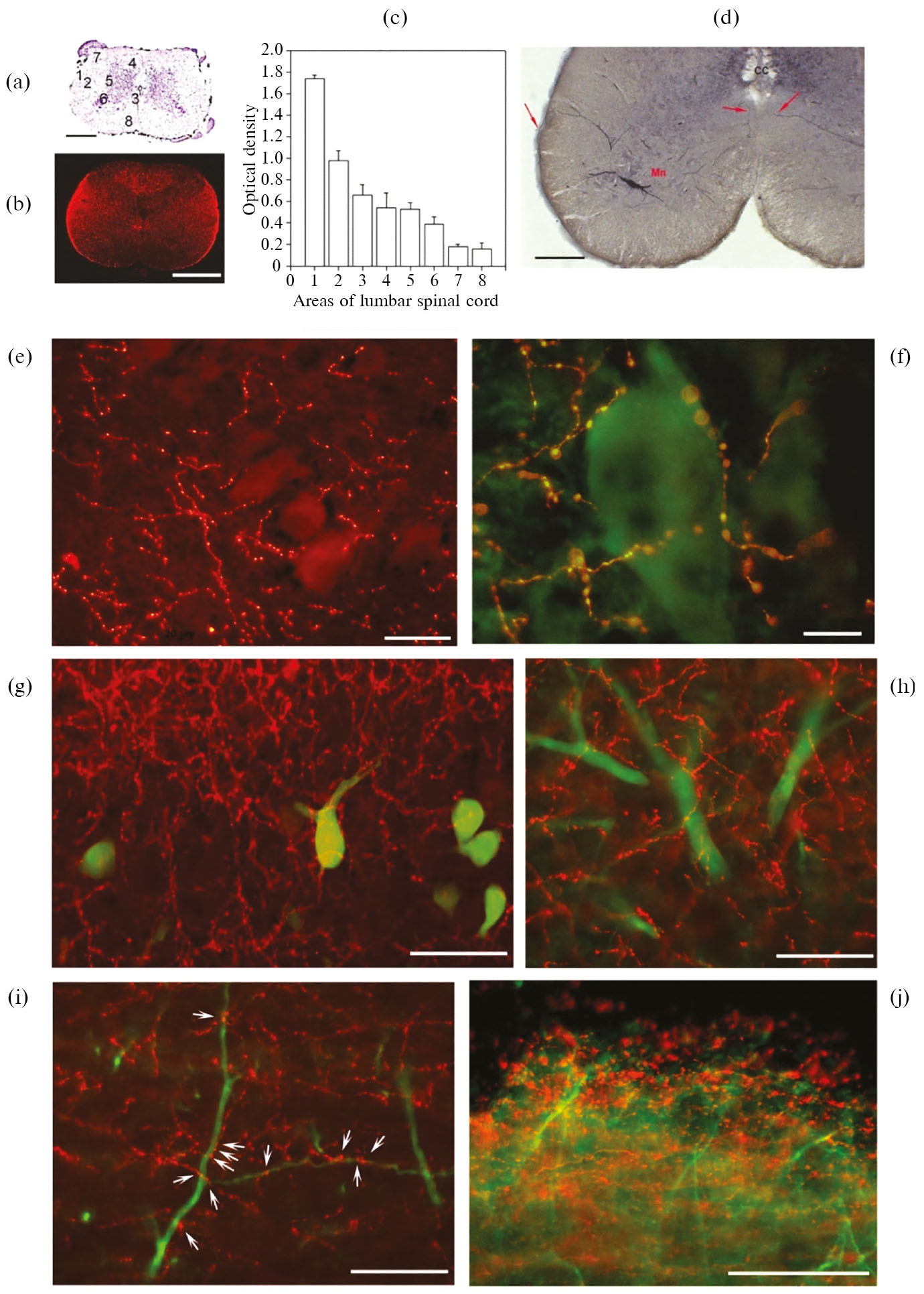 Рис. 7. Распределение серотониниммунореактивных элементов в поясничных сегментах и возможные контакты 5-НТ+ir терминалей с мотонейронами, меченными внутриклеточно инъекцией нейробиотина или аппликацией маркеров на вентральный корешок: (а) – фронтальный срез поясничного сегмента IХ, окрашенный по Нисслю, для сравнительной ориентации участков срезов с 5-НТ иммунореакцией (b); (b) – фронтальный срез Х поясничного сегмента с5-НТ+ir; (c) – гистограмма интенсивностей (в условных единицах от 0 до 2.0) сигнала 5-НТ+ir участков (1–8) поясничного утолщения спинного мозга: 1– перимедуллярное сплетение (маргинальный плексус); 2 – латеральный канатик; 3 – вентральная комиссура; 4 – дорсальный рог; 5 – интермедиальная зона; 6 – моторное ядро; 7 – область входа дорсальнокорешковых волокон; 8 – вентромедиальный канатик; (d) – изображение фрагмента поясничного сегмента IХ с мотонейронами, меченными внутриклеточной инъекцией нейробиотина и последующим выявлением DAB реакцией. Реконструкция по двум фронтальным серийным срезам. Слева видна сома мотонейрона с проксимальными и дистальными участками его дендритного дерева. Справа от медиальной линии видны дендриты мотонейрона, меченного внутриклеточно в правой половине мозга. Тончайшие дистальные дендриты мотонейрона слева ветвятся в перимедулярном плексусе (область 1 на гистограмме рис. 7c). В вентральной комиссуре (область 3 – на гистограмме), где располагаются ISN, простираются дендриты мотонейронов, регистрируемых в обеих половинах спинного мозга; (e) – редкие 5-НТ+ir терминальные ветвления в моторном ядре фронтального тонкого среза мозга поясничного сегмента; (f) – 5-НТ+ir ветвления в моторном ядре на фронтальном срезе мозга толщиной 40 мкм другого препарата. Их возможные контакты видны на теле мотонейрона, меченого ретроградно декстран-родомином; (g – j) – участки сагиттальных срезов поясничного утолщения с возможными контактами 5-НТ+ir терминальных ветвлений на телах меченых биоцитином мотонейронов (g), проксимальных дендритах (h), дендритах высших порядков (i). Область наивысшей интенсивности 5-НТ+ir, перимедулярный плексус (j), пронизана тонкими дистальными дендритами многих мотонейронов, где предполагается высокая вероятность контактов с серотониниммунореактивными синаптическими бутонами. Масштаб: (а), (b) – 500 мкм; (d) – 200 мкм; (g) – 100 мкм; (e), (h – j) – 50 мкм; (f) – 20 мкм.