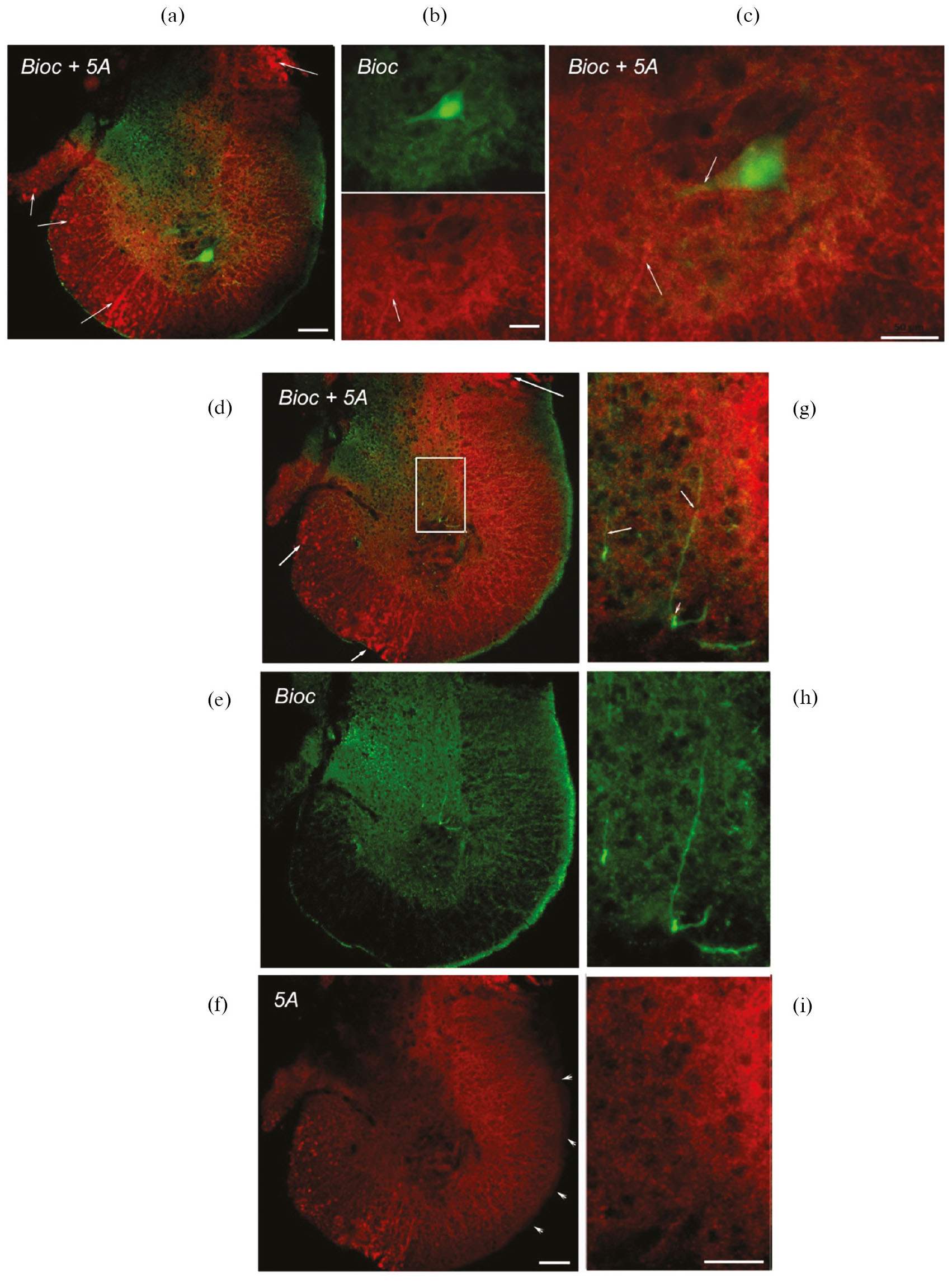 Рис. 9. Ретроградно меченые биоцитином мотонейроны поясничных сегментов и 5-НТ5ARlike+ иммунореактивность на фронтальных срезах поясничного сегмента Х: (а) – фронтальный срез мозга при малом увеличении объектива с двумя сигналами флуоресценции: меченного биоцитином мотонейрона (зеленый) и 5-НТ5ARlike+ сигнала (красный) в нейропиле. Яркий контрастный 5-НТ5ARlike+ сигнал (стрелки) виден в виде колец в медиальном канатике, в виде пятен, колец, полосок – в области входа афферентных волокон в дорсальный рог, в вентральном канатике по ходу моторных аксонов; (b) – раздельные изображения участка с флуоресцирующим маркированным мотонейроном и 5-НТ5ARlike+ флуоресценцией; (c) – на совмещенном изображении видно присутствие 5-НТ5ARlike+ сигнала в виде зерен на соме и первичном вентральном дендрите мотонейрона (стрелка), в вентральной части серого вещества с яркой полоской миелиновой оболочки аксона мотонейрона; (d – i) – композиция изображений другого среза с выделенной областью (g, h, i) дорсально направленных дендритов меченого мотонейрона. На совмещенном изображении (g) можно видеть 5-НТ5ARlike+ сигнал в виде зерен на тонких дендритах мотонейрона (стрелки). В перимедулярном сплетении 5-НТ5ARlike+ сигнал отсутствует (f - малые стрелочки). Масштаб: (а), (d), (e), (f) – 100 мкм; (b), (c), (g), (h), (i) – 50 мкм.