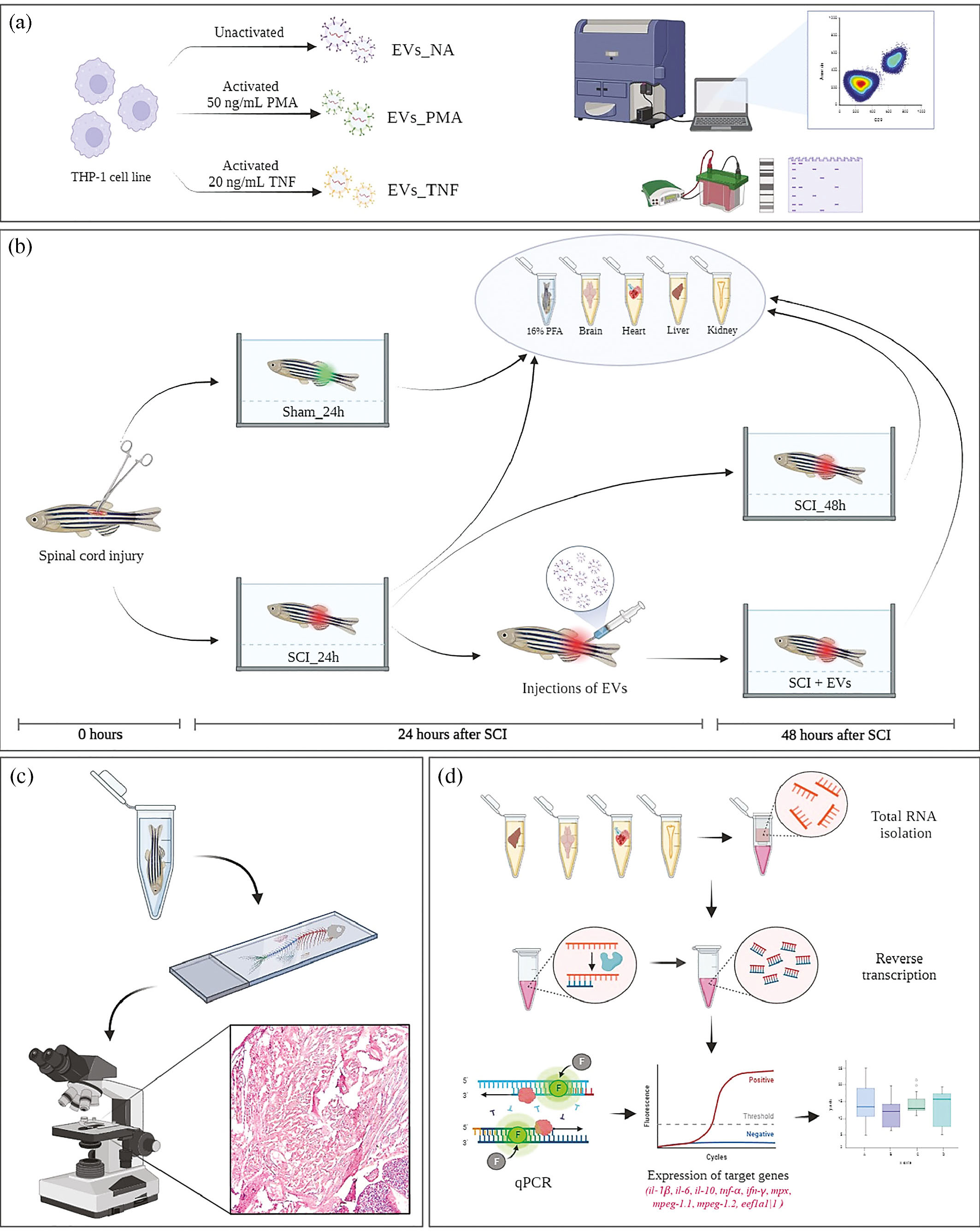 Исследование эффектов внеклеточных везикул проводили на рыбах Danio rerio с моделью повреждения спинного мозга (рис. 1b). Образцы ВВ, ресуспендированные в DPBS без Ca2+ и Mg2+ (Биолот, Россия), вводили в целомическую полость рыбам через 24 ч после повреждения спинного мозга, и еще через сутки выводили из эксперимента. На всех этапах, начиная с 24 ч, проводили фиксирование случайно отобранных рыб из каждой группы в параформальдегиде и биобанкирование жизненно важных органов (мозг, сердце, печень и почку) (рис. 1b).