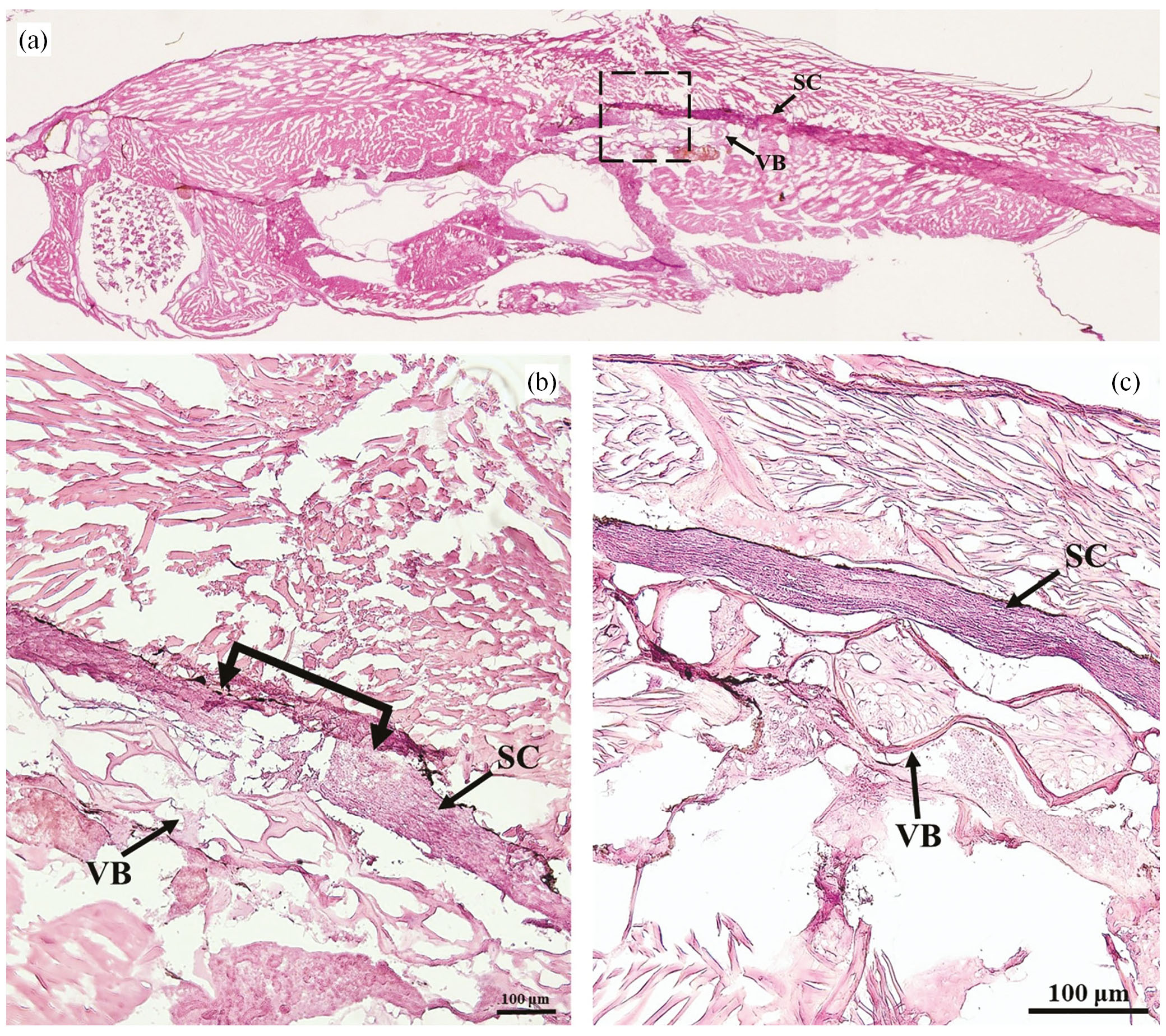 Рис. 2. Сагиттальные срезы поврежденного (а-b) и неповрежденного (с) спинного мозга рыб Danio rerio, окрашенные гематоксилин-эозином. (а) – срез рыбы Danio rerio с моделью травмы спинного мозга; (b) – увеличенное изображение травмы спинного мозга, выделенное квадратом на (а); (с) – неповрежденный спинной мозг. SC – спинной мозг, VB – тела позвонков.