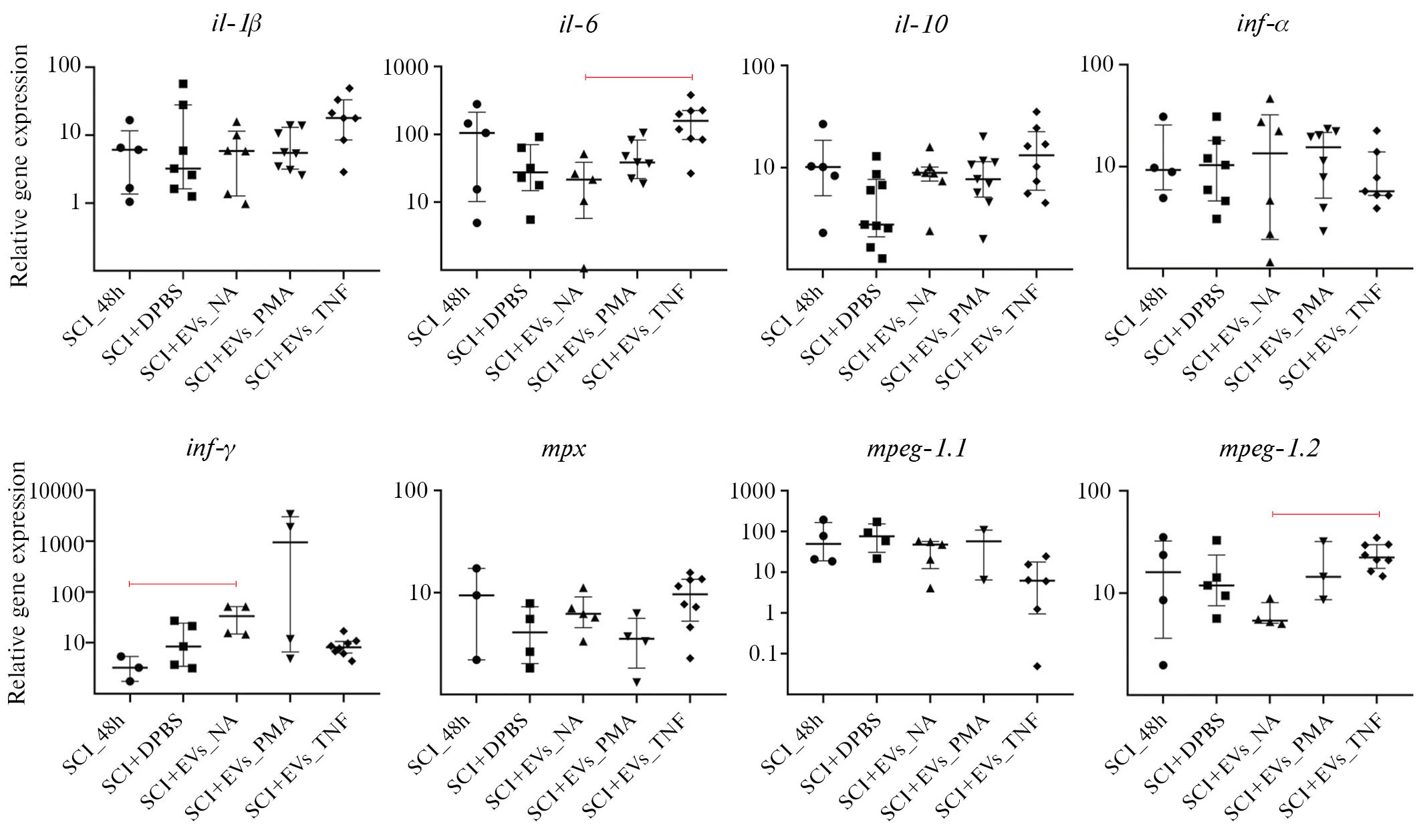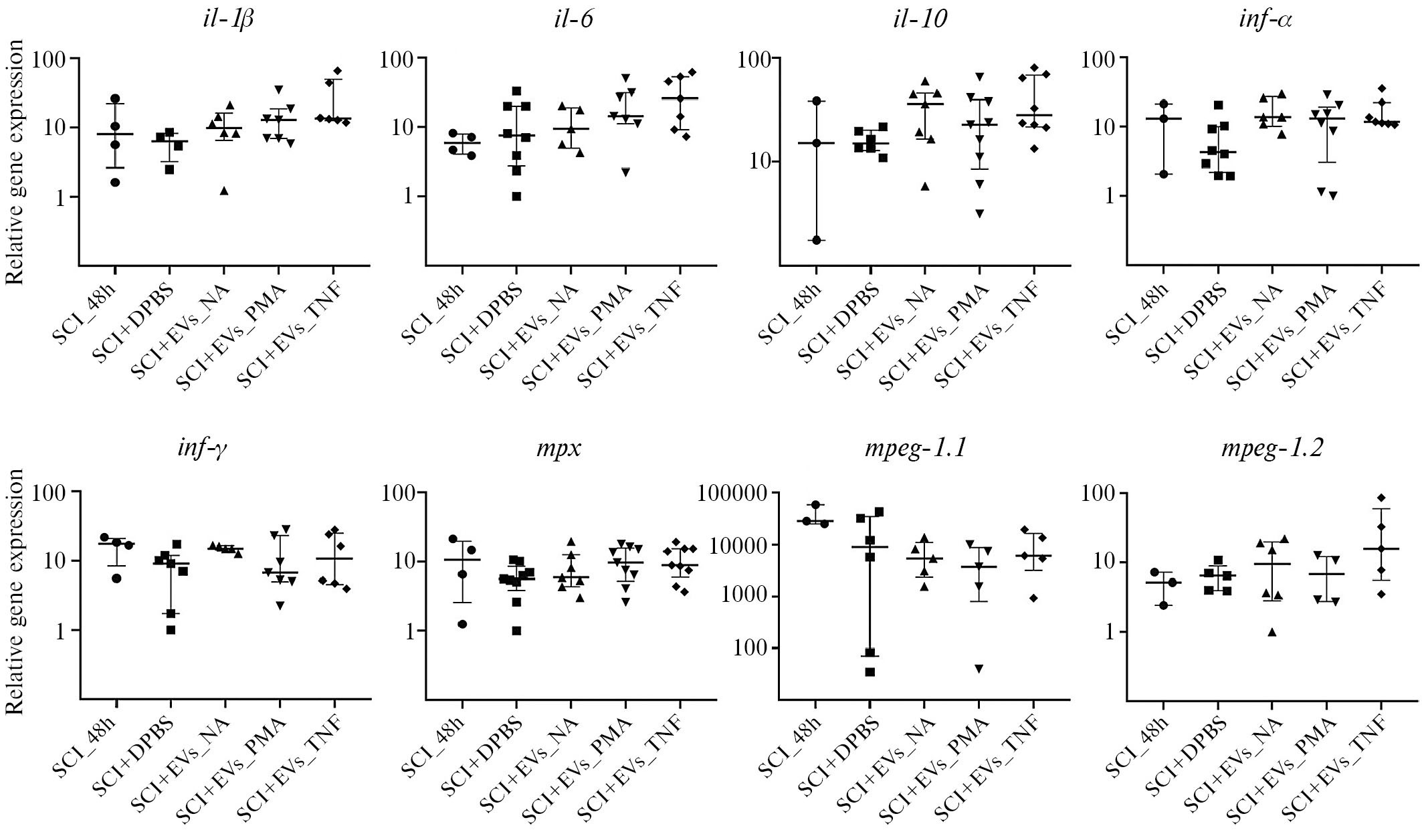 Рис. 4. Относительная экспрессия генов il‑1β, il‑6, il‑10, tnf-α, ifn-γ, mpx, mpeg‑1.1, mpeg‑1.2 в тканях мозга рыб Danio rerio с функционально подтвержденной травмой спинного мозга и введением внеклеточных везикул.