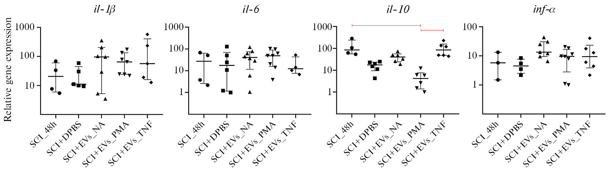 Введение раствора DPBS и двух образцов ВВ вызывало достоверное изменение уровня экспрессии гена противовоспалительного il-10 в тканях сердца рыб (p<0.001). При этом ВВ в группе SCI+EVs_РМA вызывали достоверное снижение уровня экспрессии (p=0.002), в то время как образцы в группе SCI+EVs TNF не оказывали аналогичного воздействия, и уровень экспрессии il-10 не отличался от такового в группе с повреждением SCI_48 h (рис. 5, табл. 3).