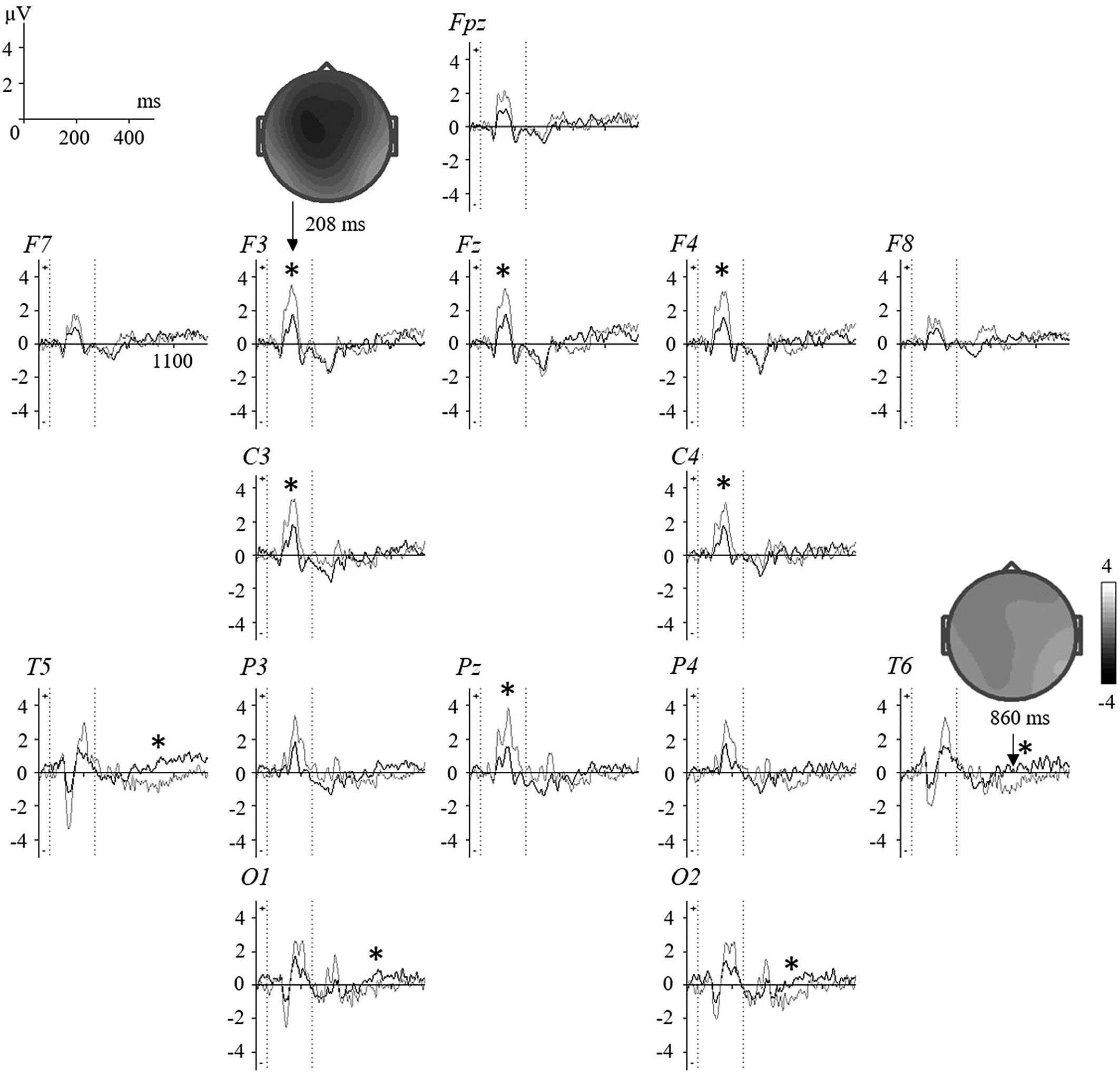 Рис. 2. Вызванные потенциалы при выполнении нетворческого задания в условиях сотрудничества в паре (черная линия) и индивидуально (серая линия). Обозначения: Fpz-O2 – расположение электродов. Для каждого электрода по оси x – время после предъявления первого стимула (мс); по оси y – амплитуда ВП (мкВ). Вертикальные пунктирные линии обозначают начало и конец предъявления стимула (длительность стимула 400 мс). Положительная полярность (плюс) – вверху. Звездочками отмечены электроды и компоненты ВП, амплитуда которых значимо различалась между условиями. Топограмма представляет распределение амплитуд в обозначенный момент времени внутри интервалов различий.