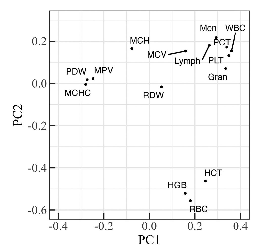 Рис. 2. График нагрузок, полученный в результате анализа методом главных компонент показателей крови длиннохвостого суслика Urocitellus undulatus.