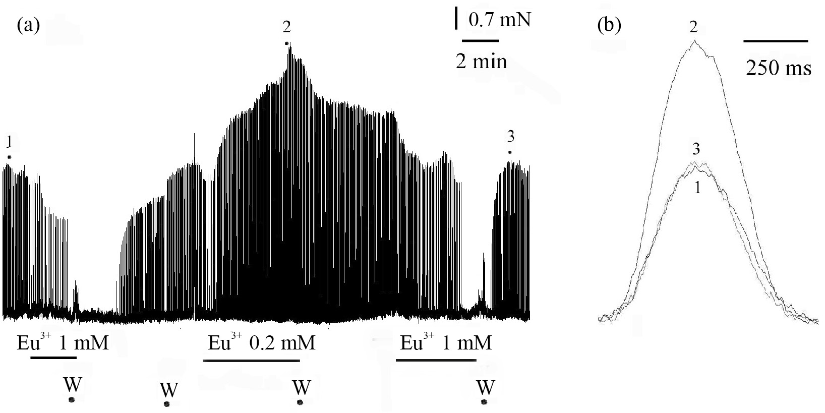 Регистрацию сокращений осуществляли с помощью тензодатчиков, передающих сократительный сигнал с мышечного препарата на компьютер. Обработка сигнала от тензодатчиков производилась в программе WinPulse, сила сокращения выражалась в Ньютонах (Н). Учитывали следующие параметры сокращения: максимальное сокращение (Fmax, мН); частота сокращений (Hz); максимальная скорость нарастания силы сокращения (Vmax, мН/с); время, необходимое мышце для достижения максимальной силы сокращения (t, с), и период полурасслабления (t1/2rel, с). Регистрацию сокращений предсердий проводили в изометрическом режиме при 20°С. Нитрат европия (Eu(NO3)3) был приготовлен в виде 100 мМ сток-раствора, который добавляли в нормальный физиологический раствор для холоднокровных животных (раствор Рингера) перед экспериментом до конечных концентраций 0.2 мМ и 1 мМ. Инкубация предсердий с Eu3+ осуществлялась 6-7 мин. Параметры сокращений измеряли до аппликации Eu3+ и в конце инкубации с металлом. Параметры сокращений в одном опыте усреднялись из нескольких сокращений (около 30) в течение 1 мин. Инкубацию предсердий с азидом натрия (NaN3) осуществляли около 9 мин в контроле и через 20 мин после отмывания 0.2 мМ Eu3+. В работе было использовано 4 лягушки для каждого эксперимента.