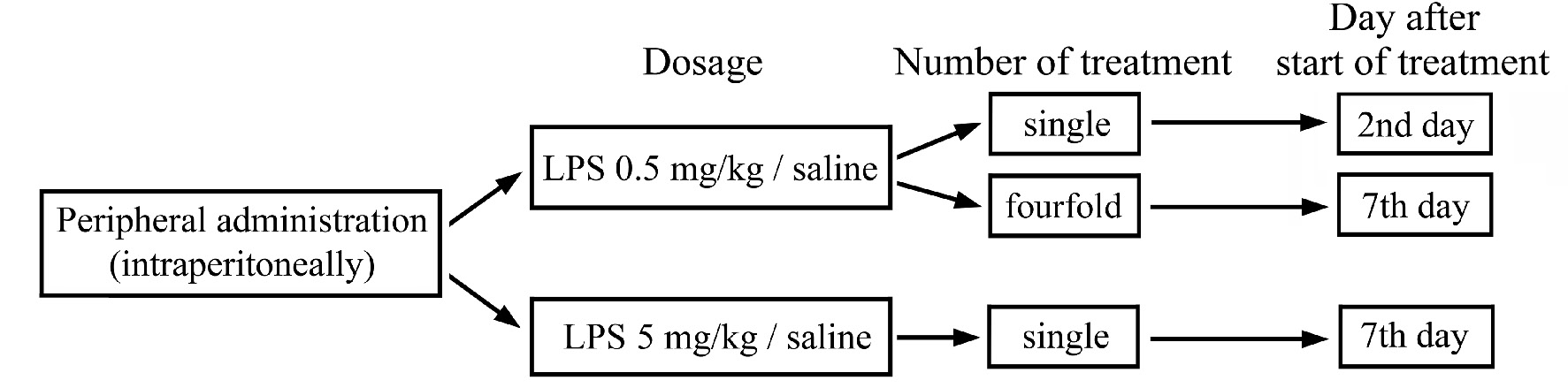 Рис. 1. Схема эксперимента. Взрослым самцам крыс внутрибрюшинно вводили ЛПС в дозах 0.5 мг/кг (однократно и четырехкратно 1 раз в 2 дня в течение 7 дней, животных выводили из эксперимента через сутки после последнего введения) и 5 мг/кг (однократно, животных выводили из эксперимента через 7 дней после введения препаратов). Контрольные животные получали соответствующие инъекции физиологического раствора.