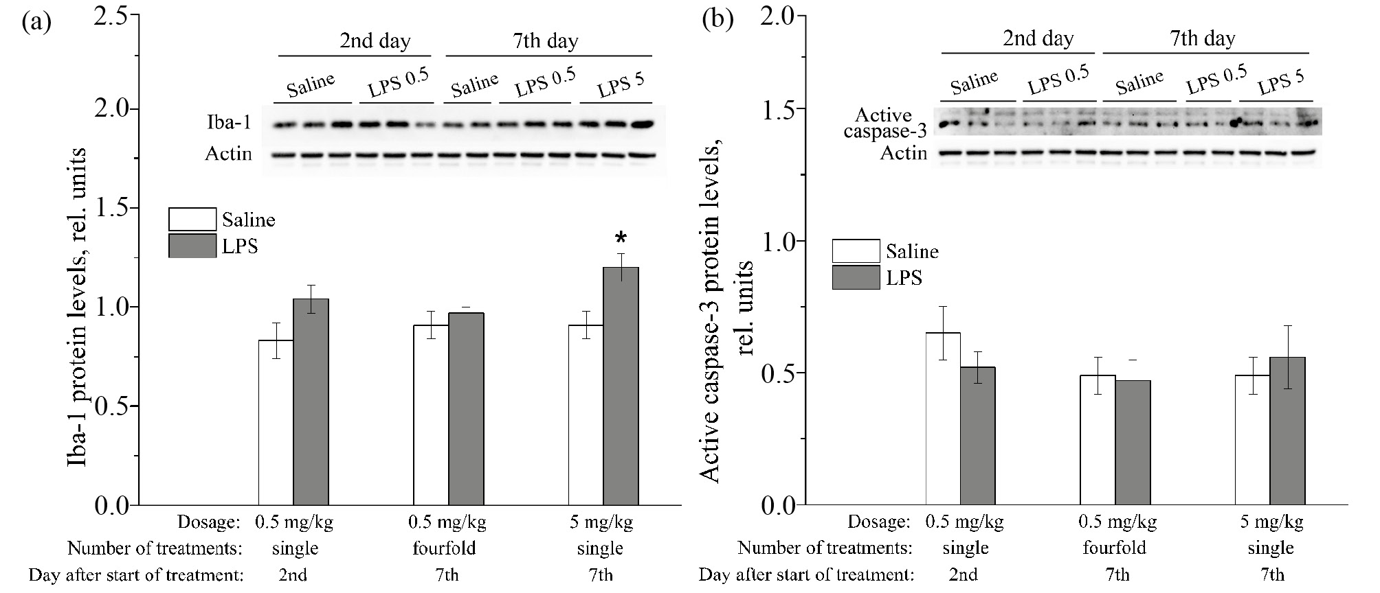 Рис. 2. Уровень белков Iba-1 (a) и активной каспазы-3 (b) в стволе мозга взрослых крыс после периферического введения ЛПС в разных дозах и режимах. M ± m, выраженные в условных единицах относительно уровня белка β-актина, n = 5–6 животных на группу. * — p < 0.05 по сравнению группой, получавшей инъекцию физиологического раствора (one-way ANOVA, критерий LSD).
