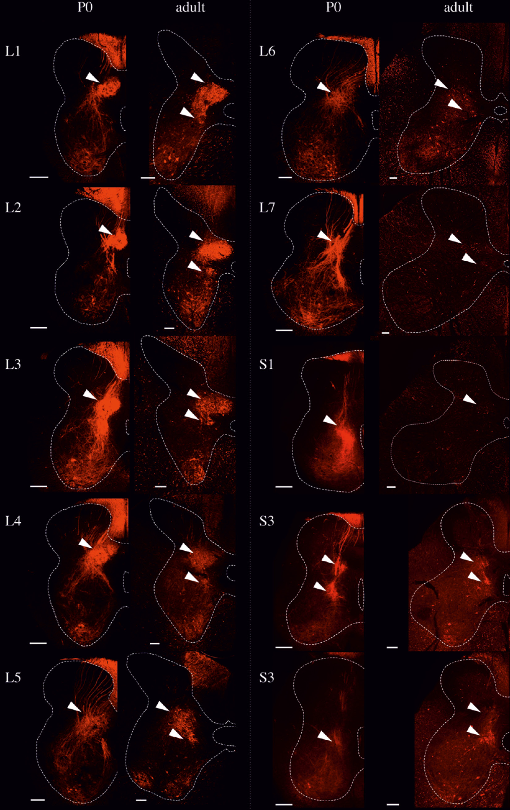 Вне зависимости от сегмента, у взрослых кошек областью максимальной локализации ПВ+ нейронов и ПВ+ нейропиля является медиальная часть пластин V–VII и область вокруг мотонейронных пулов. В верхнепоясничном отделе первая область соответствует локализации ядер Кларка. В нижнепоясничных сегментах также выявлены скопления ПВ+ нейронов: в тех же областях серого вещества, что и в вышележащих сегментах. значительно число ПВ+ нейронов у животных обоих возрастов выявлено в области вокруг мотонейронных пулов. Редкие ПВ+ нейроны также выявляются в пластинах II–III, но только у взрослых животных. Таким образом, единственными ПВ+ нейронами у новорождённых являются нейроны пластин VII–IX вокруг мотонейронных пулов (площадь сомы нейронов: 317 ± 106 мкм2).