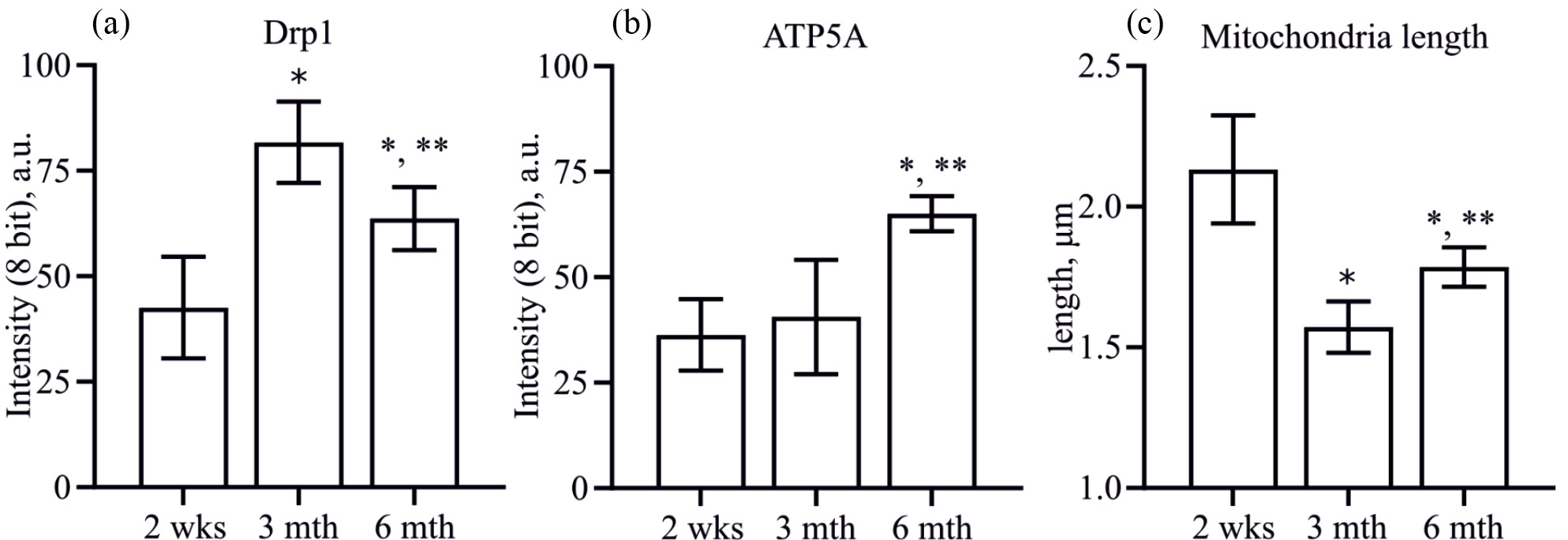 Рис. 3. Изменения митохондриальных показателей в клетках трансплантата. (a) — интенсивность флуоресценции (8 бит, градации яркости) при использовании антител к Drp1; (b) — интенсивность флуоресценции (8 бит, градации яркости) при использовании антител к ATP5A; (c) — изменения длины MTC02-позитивных объектов (“mitochondria length”) (мкм); Обозначения как на рис. 1.