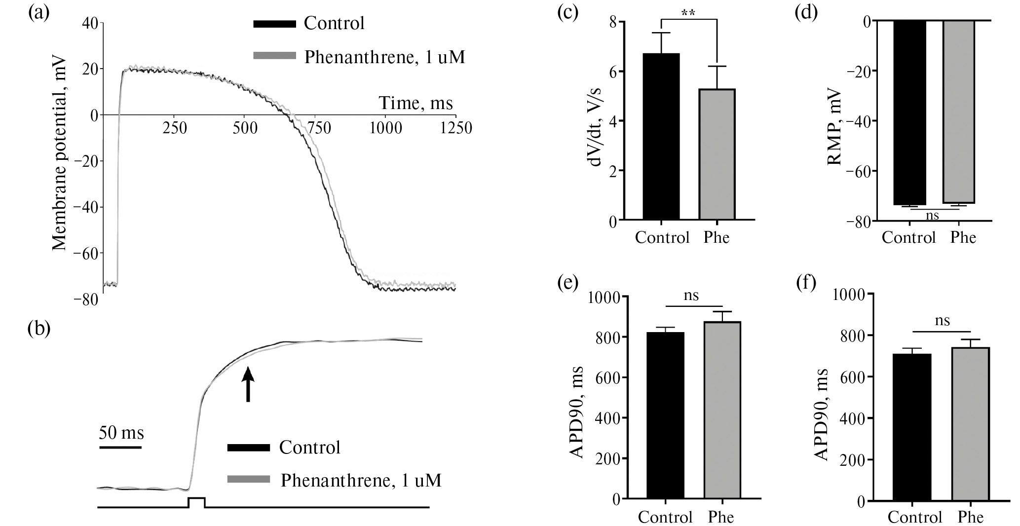 Несмотря на отсутствие видимых глазу изменений, в присутствии 1 мкМ фенантрена фаза быстрой деполяризации ПД удлинялась, что отражено в снижении максимальной скорости нарастания переднего фронта ПД (рис. 1b, c). Прочие оцениваемые параметры, а именно мембранный потенциал покоя и длительность ПД на уровне 90% и 50% реполяризации в присутствии 1 мкМ фенантрена не изменялись (рис. 1d-f, соответственно).