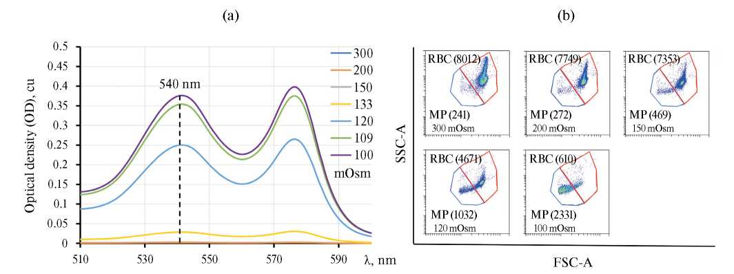 Рис. 1. Примеры первичных данных, полученных методами спектрофотометрии и проточной цитометрии. (a) — спектрофотометрия. Разными цветами показаны графики зависимости оптической плотности (OD) от длины волны (λ), отмечена использованная длина волны (540 нм). OD возрастает по мере снижения осмоляльности. Точка перед началом лизиса (Rmax) — 150 мОсм. (b) — проточная цитометрия. Снижение осмоляльности ведет к снижению числа регистрируемых событий в области с клетками (RBC) и росту количества микрочастиц (MP). Точка перед началом лизиса (Rmax) — 200 мОсм. Приведенные данные получены на эритроцитах человека. Выделение красным — область с эритроцитами, выделение синим — область с микрочастицами.