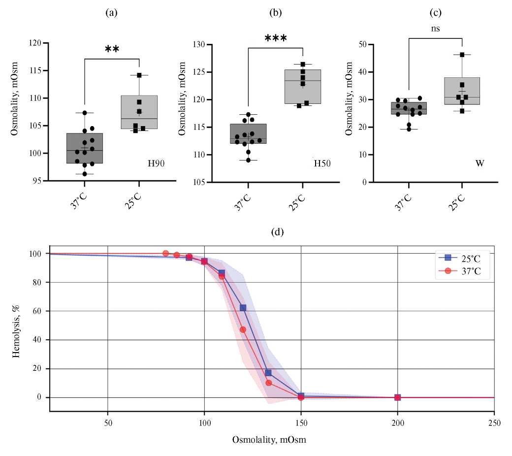 Влияние температуры на осмотическую резистентность эритроцитов. Известно, что осмотическая резистентность зависит от температуры [33], которая не учитывается при использовании других методов. Для оценки влияния температуры, провели серию экспериментов по определению осмотической резистентности по методу лазерной дифракции при 25°C (комнатная температура, используемая при применении других методов) и 37°C (физиологическая температура для эритроцитов человека). При 25°C существенно возрастают H50 и H90 (рис. 4a, b), однако гетерогенность популяции клеток по степени устойчивости к гипоосмотическому лизису (W) значимо не изменяется (рис. 4с). Лизисная кривая при 25°C смещена в область более высоких осмоляльностей (рис. 4d).