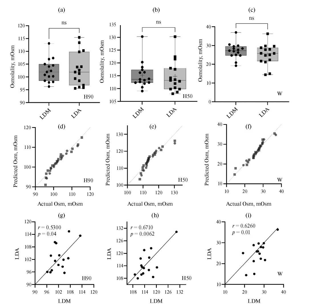 Рис. 6. Сравнение результатов автоматического и мануального методов лазерной дифракции при анализе осмотической резистентности эритроцитов человека. (a) — сравнение результатов по H90. (b) — сравнение по H50. (c) — сравнение по W. Усы — минимум и максимум, + — среднее значение, n = 15, ns — p > 0.05, Paired t test. (d) — QQ-plot для H90. (e) — QQ-plot для H50. (f) — QQ-plot для W. Predicted — квантили стандартного нормального распределения. (g) — корреляции между мануальным и автоматическим методами по параметрам H90. (h) — корреляция по H50. (i) — корреляция по W. левый верхний угол — Pearson r и p-value. LDM — мануальный метод лазерной дифракции, LDA — автоматический метод лазерной дифракции.