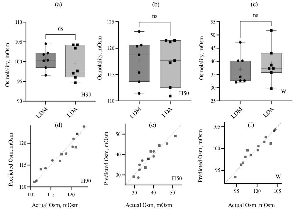 Рис. 7. Сравнение результатов автоматического и мануального методов лазерной дифракции при анализе осмотической резистентности эритроцитов крыс. (a) — сравнение результатов по H90. (b) — сравнение по H50. (c) — сравнение по W. Усы — минимум и максимум, + — среднее значение, n = 7, ns — p > 0.05, Paired t test. (d) — QQ-plot для H90. (e) — QQ-plot для H50. (f) — QQ-plot для W. Predicted — квантили стандартного нормального распределения.