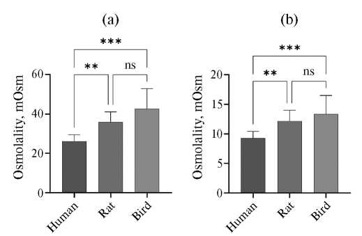 Рис. 10. Сравнение гетерогенности популяции эритроцитов высших позвоночных по устойчивости к гипоосмотическому лизису. (a) — сравнение в абсолютных величинах (mOsm). (b) — Сравнение в относительных величинах (процент от физиологической осмоляльности плазмы). Температуры и физиологические осмоляльности: 41°C и 320 мОсм для Coturnix japonica (n = 6), 37°C и 283 мОсм для Homo sapiens (n = 15), 37°C и 294 мОсм для Rattus norvegicus (n = 7). Использован мануальный метод лазерной дифракции. ns — p > 0.05, ** — p < 0.01, *** — p < 0.001, Tukey’s multiple comparisons test.