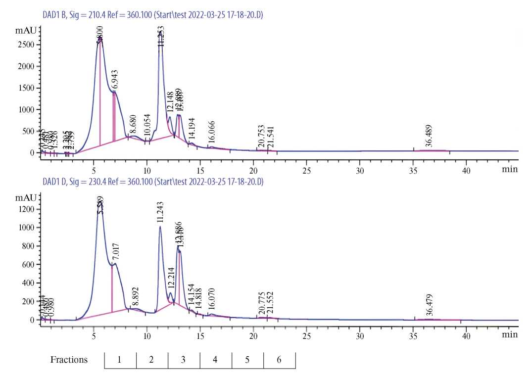 Рис. 1. Хроматографический профиль лизата естественных киллеров линии NK-92 при длинах волн 210 и 230 нм (время удерживания фракций составляет три минуты)