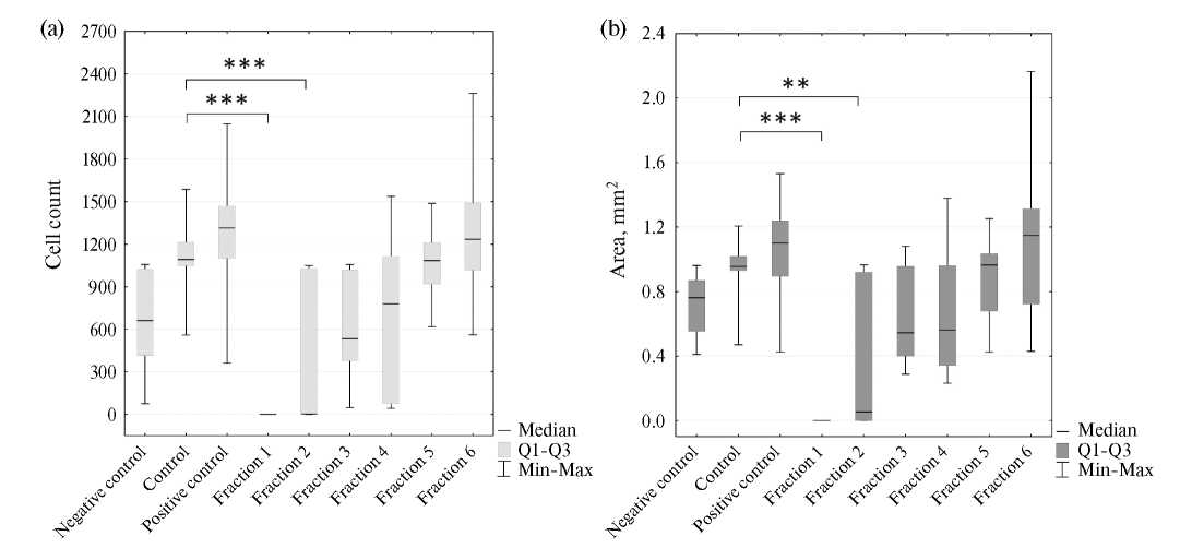 Установлено, что фракции №№1-2 не позволили клеткам трофобласта мигрировать через мембрану полностью. В случае добавления в культуральную среду фракций №№3-6 достоверных различий обнаружено не было (рис. 4а). Было показано также, что площадь, занимаемая мигрировавшими клетками при совместном культивирования с фракциями №№1-2, не превышала значение площади базового контроля, в иных случаях (фракции №№3-6) достоверных различий обнаружено не было (рис. 4b).