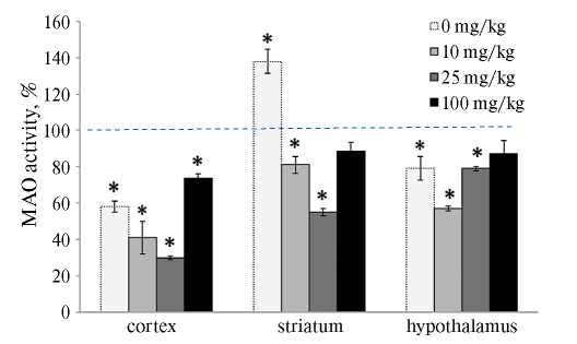 Рис. 2. Изменение активности МАО в структурах мозга крыс после их экспозиции в гипербарическом кислороде под давлением 5 АТА с предварительным введением различных доз пиразидола. *р < 0.05 по отношению к активности МАО при дыхании воздухом (пунктирная линия)