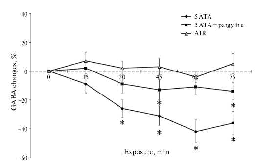 В третьей серии опытов измеряли содержание внеклеточной ГАМК в стриатуме крыс, находящихся в барокамере под давлением кислорода 5 АТА. Для этого наркотизированным животным (уретан 750 мг/кг + хлоралоза 250 мг/кг, внутрибрюшинно) в стриатум (координаты такие же, как для измерения кровотока) вводили микродиализные канюли (CMA/11, CMA/Microdialysis AB, Швеция). Во время ГБО2-экспозиции канюли перфузировали искусственным ликвором со скоростью 1.0 мкл/мин, а пробы диализата обьемом 15 мкл автоматически отбирали каждые 15 мин (CMA 142 Microfraction Collector, AB, Швеция). Биоэлектрическую активность коры мозга (ЭКоГ) у наркотизированных животных в ГБО2 регистрировали с помощью винтов из нержавеющей стали диаметром 2.4 мм. Один винт вводили через отверстие в теменной кости черепа до соприкосновения с твердой мозговой оболочкой, а другой, индифферентный, — в лобную пазуху. Для регистрации ЭКоГ использовали измерительный комплекс с вычислением спектральных характеристик биоэлектрического процесса (LabView 2, iWORK, CA, США. Появление судорожной активности мозга оценивали по наличию повторяющихся комплексных спайков.