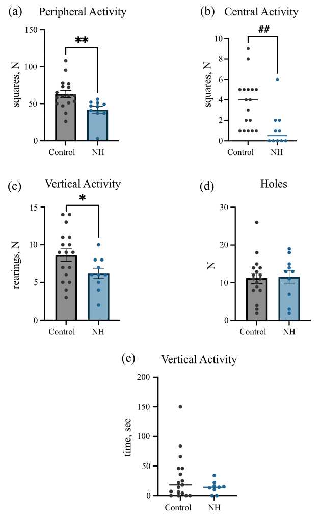 Так в тесте “открытое поле” НГ крысы демонстрировали достоверно сниженную периферическую (рис. 4a, p = 0.008, Student’s t-test), центральную (рис. 4b, p = 0.006, Mann-Whitney test) и вертикальную активность (рис. 4c, p = 0.05, Student’s t-test) по сравнению с контрольными животными. Различий в количестве исследуемых норок или времени, потраченном на груминг между контрольными и НГ животными не выявлено (рис. 4d, рис. 4e).