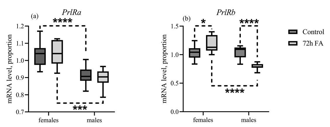 Рис. 3. Экспрессия генов PrlRa и PrlRb в ткани почек самок и самцов колюшек в зависимости от пола и адаптации к пресной воде. По оси Y: относительные уровни мРНК генов пролактиновых рецепторов PrlRa (a) и PrlRb (b) в ткани почек. По оси X: группы самок (“females”) и самцов (“males”) трёхиглой колюшки в условиях морской воды (“control”, тёмно-серые ящики) и после 72-часовой пресноводной адаптации (“72h FA”, светло-серые ящики). Количество в каждой группе: n = 10. Пунктирная линия указывает группы, между которыми обнаружены статистически значимые различия (* – p < 0.05; *** – p < 0.001, **** – p < 0.0001, two-way ANOVA)