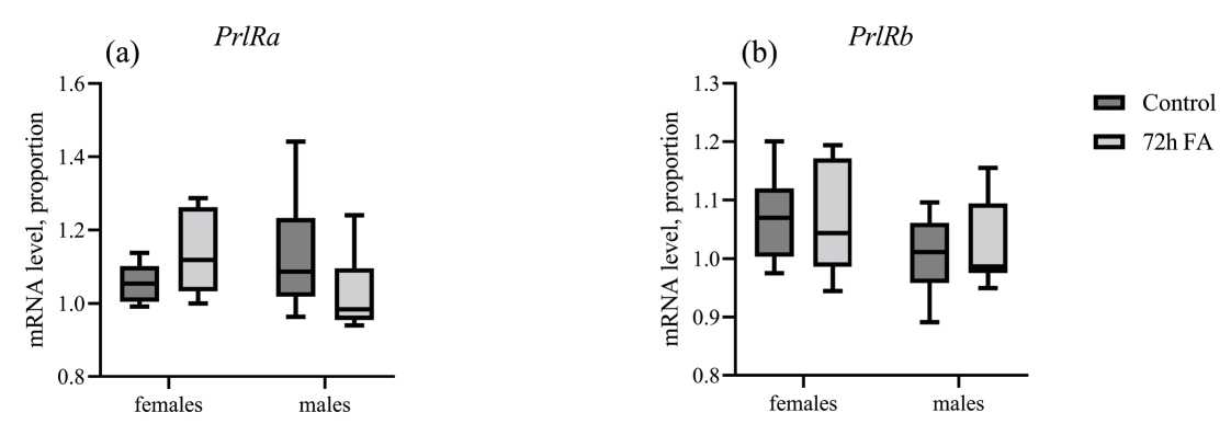 Рис. 4. Экспрессия генов PrlRa и PrlRb в ткани жабр самок и самцов колюшек в зависимости от пола и адаптации к пресной воде. По оси Y: относительные уровни мРНК генов пролактиновых рецепторов PrlRa (a) и PrlRb (b) в ткани жабр. По оси X: группы самок (“females”) и самцов (“males”) трёхиглой колюшки в условиях морской воды (“control”, тёмно-серые ящики) и после 72-часовой пресноводной адаптации (“72h FA”, светло-серые ящики). Количество в каждой группе: n = 10