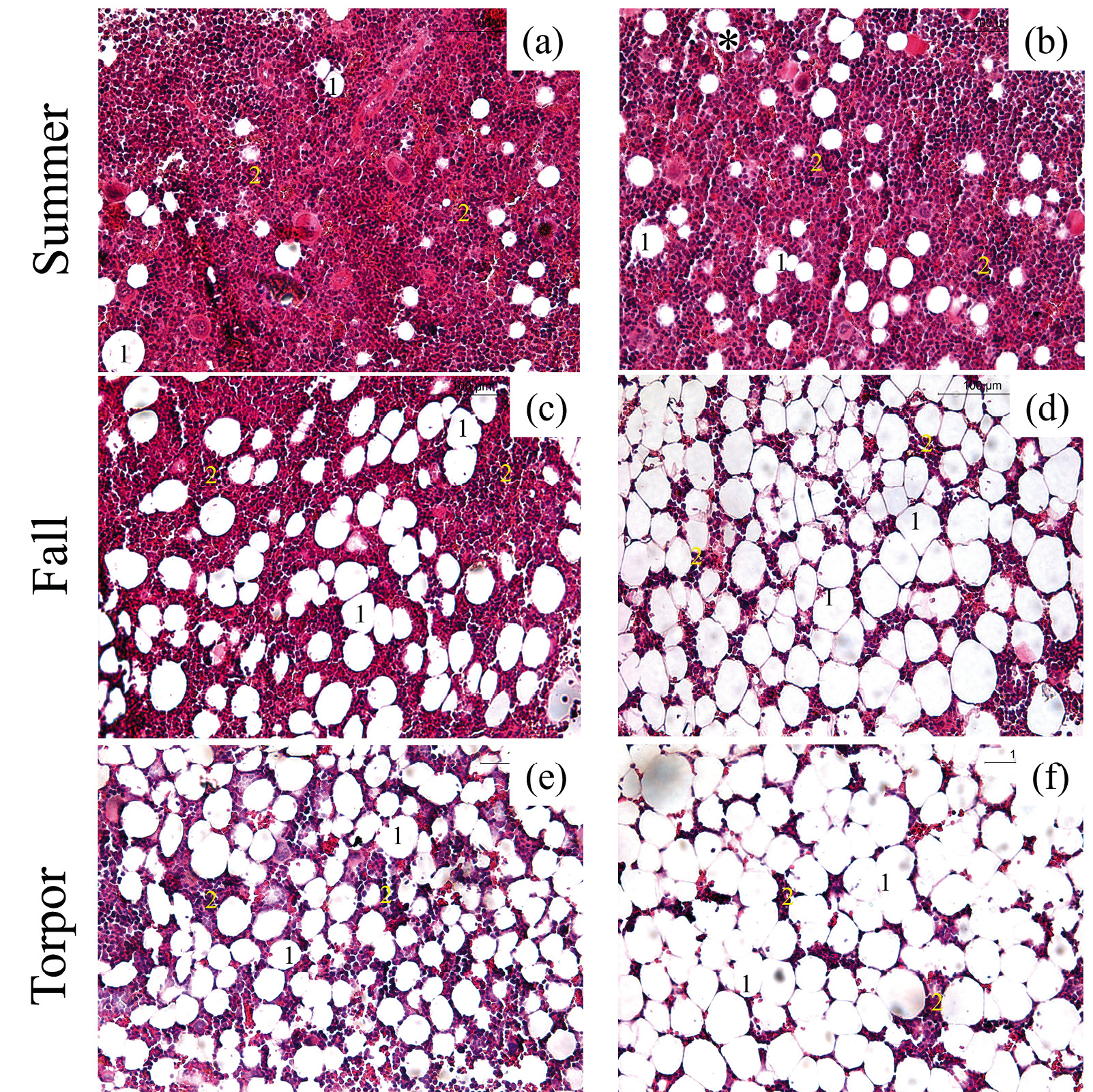 Рис. 1. Микрофотографии препаратов костного мозга длиннохвостых сусликов Urocitellus undulatus в активном летнем, осеннем и торпидном состоянии. Окраска гематоксилин – эозин. (a), (b) – летние животные, (c), (d) – осенние, (e), (f) - торпидные. (a), (c), (e) – костный мозг из плеча, (b), (d), (f) – костный мозг из бедра. Адипоциты отмечены цифрой 1, эритроидные островки цифрой 2. Световая микроскопия.