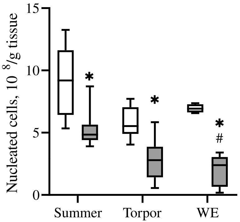 Рис. 4. Изменения количества ядерных клеток *10⁸/г ткани костного мозга длиннохвостых сусликов в плечевой (светлые столбцы) и бедренной кости (темные столбцы) в активном летнем, торпидном и зимнем эутермном (WE) состоянии (n = 7 для каждого состояния) * – статистически значимые различия между группами в одном и том же состоянии (p <0.05). # – статистически значимые различия внутри группы от одного источника (бедренная кость) относительно лета (p <0.05).