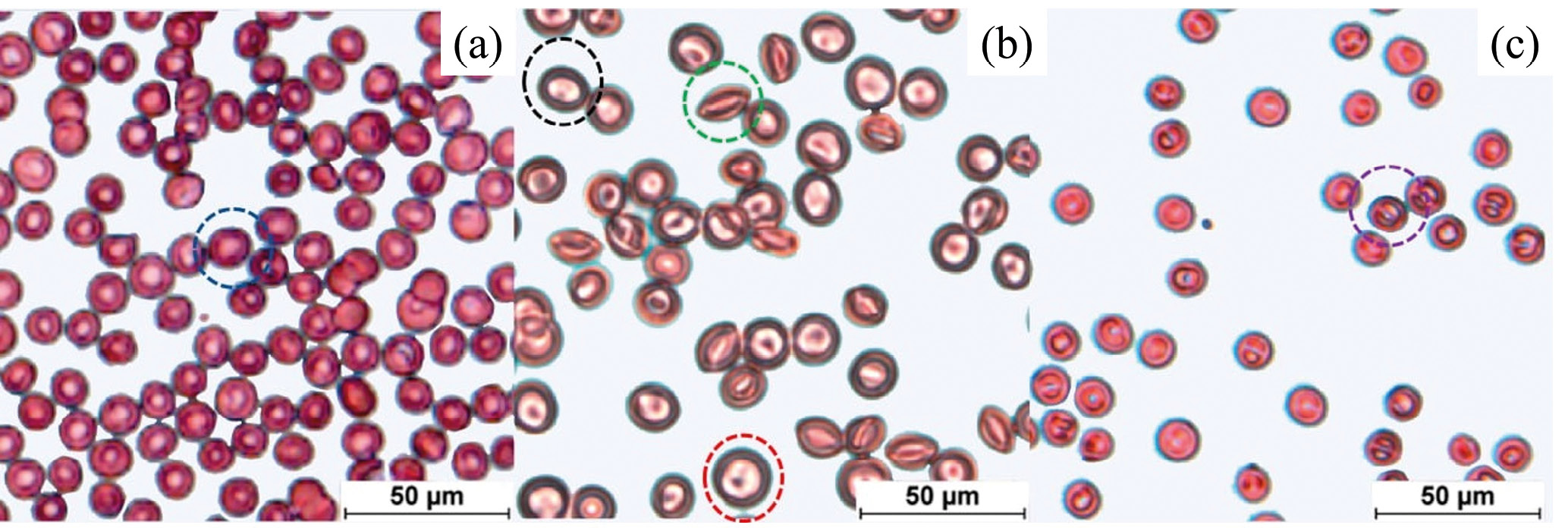 Микроскопия эритроцитов. Для микроскопии эритроцитов наносили 2-3 мкл крови на стекло, делали мазок, высушивали на воздухе, после чего окрашивали рабочим раствором Дифф-квик (АБРИС+, Россия). Микроскопирование окрашенных препаратов производили с помощью иммерсионной системы не менее, чем на 1000 эритроцитов.