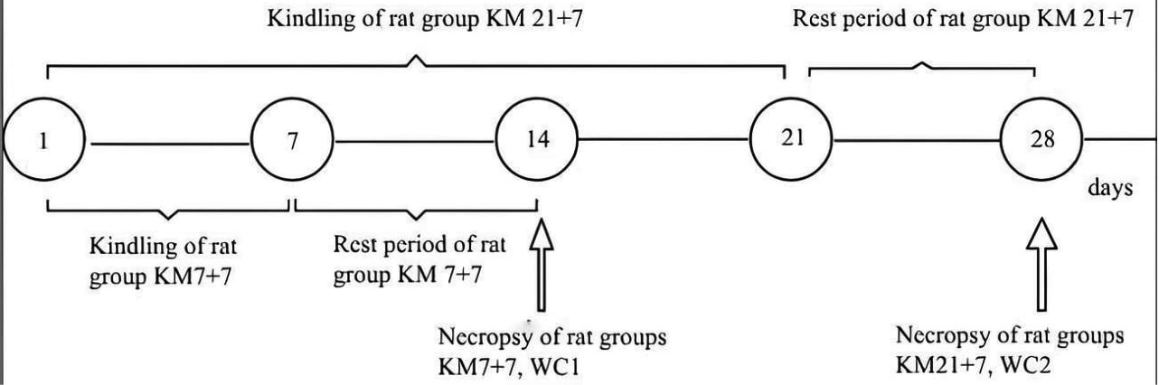 В эксперименте использованы 29 животных, распределенных в группы по 5–6 крыс в каждой (рис. 1). Для выяснения роли исследуемых белков экспериментальные группы подвергали процедуре аудиогенного киндлинга (9 kHz, 50 dB) в течение 7 и 21 дней. Во время эксперимента производилась видеофиксация. Судороги оценивали по модифицированной шкале Racine, тяжесть судорог составляла 6 баллов. После окончания киндлинга для животных наступал семидневный период покоя, по окончанию данного периода проводили некропсию с использованием препарата “Золетил”. Киндлинг в течение 21 дня подразумевает сформировавшуюся лимбическую эпилепсию, в то время как 14-дневный киндлинг ассоциирован с одними из начальных ступеней развития лимбической эпилепсии [30]. Период покоя в течение 7 дней был выбран для исследования отсроченной реакции на длительный киндлинг. В качестве положительного контроля выступали интактные крысы линии КМ (КМ Control, KMC). Некропсию контрольных крыс КМ проводили параллельно с некропсией экспериментальной группой КМ7+7 (крысы КМ, подвергнутые киндлингу в течение 7 дней + 7 дней покоя). В качестве дополнительного контроля выступали две интактные группы крыс линии Вистар (Wistar Control, WC). Их выводили из эксперимента одновременно с группами КМ 7+7 и КМ 21+7 (крысы КМ, подвергнутые киндлингу в течение 21 дня + 7 дней покоя).