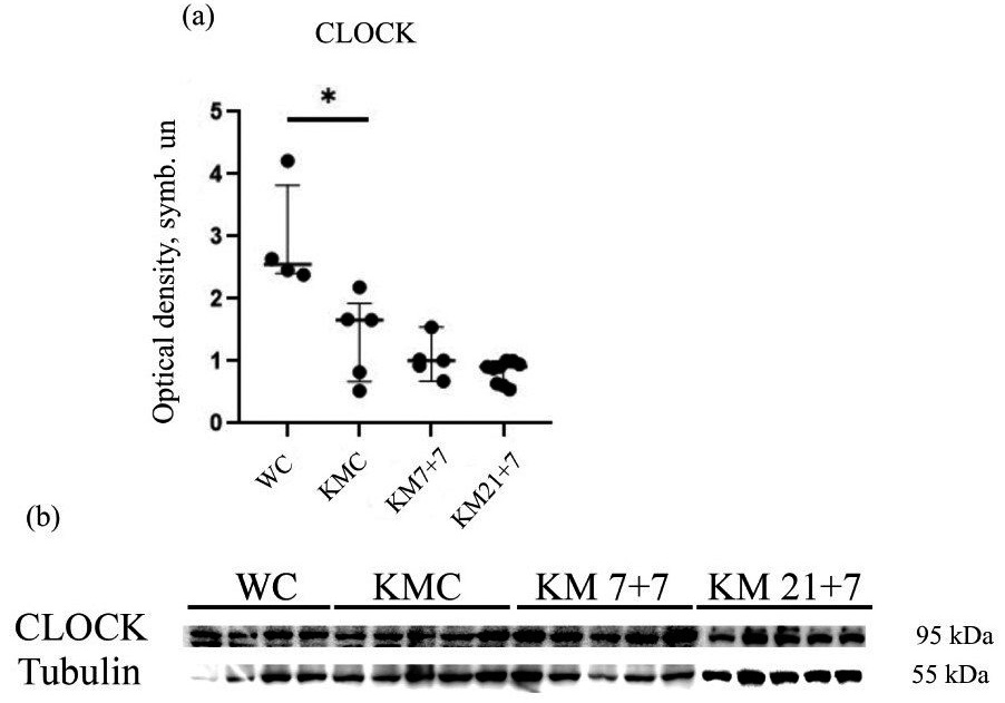 Пониженный уровень CLOCK в группе KMC относительно WC может предполагать наличие генетических особенностей линии КМ. Различные уровни этого белка в группах KM7+7 и KM21+7 свидетельствуют о развитии десинхроноза.