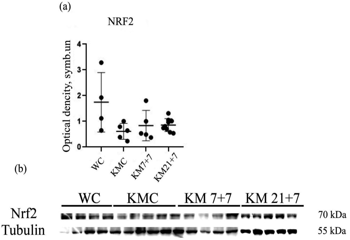 При сравнении WC (Q1 = 0.006, Med = 0.009, Q3 = 0.012, n = 3) и KMC (U = 2, Q1 = 0.012, Med = 0.019, Q3 = 0.021, n = 3, p = 0.90) мы не нашли статистически значимых различий в продукции Nrf2 (рис. 5a, b, c). Не наблюдалось изменений экспрессии этого белка у экспериментальных групп (KM 7+7: U = 9, Q1 = 0.014, Med = 0.018, Q3 = 0.020, n = 4, p = 0.03, KM21+7: U = 9, Q1 = 0.007, Med = 0.013, Q3 = 0.023, n = 4, p = 0.61) в сравнении с положительным контролем (рис. 5a). Отличия в уровнях Nrf2 у групп КМ7+7 и КМ21+7 тоже не были обнаружены (рис. 5a, 6).