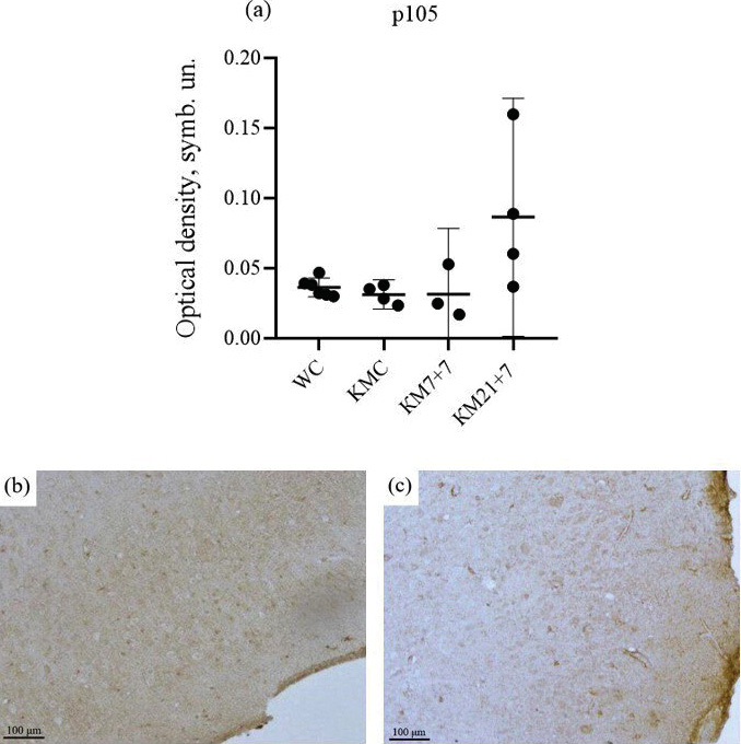 Сравнение групп крыс WC (Q1 = 0.031, Med = 0.035, Q3 = 0.041, n = 5) и KMC (U = 6, Q1 = 0.025, Med = 0.032, Q3 = 0.037, n = 4, p = 0.26) не показало значимых различий в продукции субъединицы p105 белка Nf-kB (рис. 7a). Не обнаружено отличий между контрольной группой крыс КМ и группами КМ21+7 и КМ7+7 (KM 7+7: U = 5, Q1 = 0.017, Med = 0.025, Q3 =0.053, n = 3, p = 0.8, KM21+7: U = 1, Q1 = 0.042, Med = 0.07, Q3 = 0.142, n = 4, p = 0.57). Сравнение экспериментальных групп, подвергшихся киндлингу разной продолжительности (рис. 7a), также не выявило различий.
