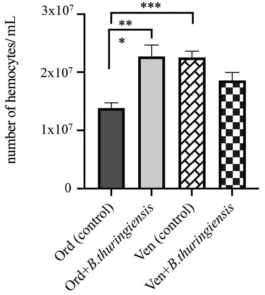 При сравнении иммунного ответа в гемолимфе личинок колорадского жука из Ордынского и Венгеровского районов на вторые сутки после заражения бактериями были получены следующие данные. Установлено, что заражение бактериями B. thuringiensis ssp. morrisoni личинок колорадского жука из Ордынского района, приводило к достоверному (p < 0.001; q = 6.49; df = 54) увеличению общего количества гемоцитов в гемолимфе насекомых в 1,6 раза по отношению к контрольной группе (рис. 3).