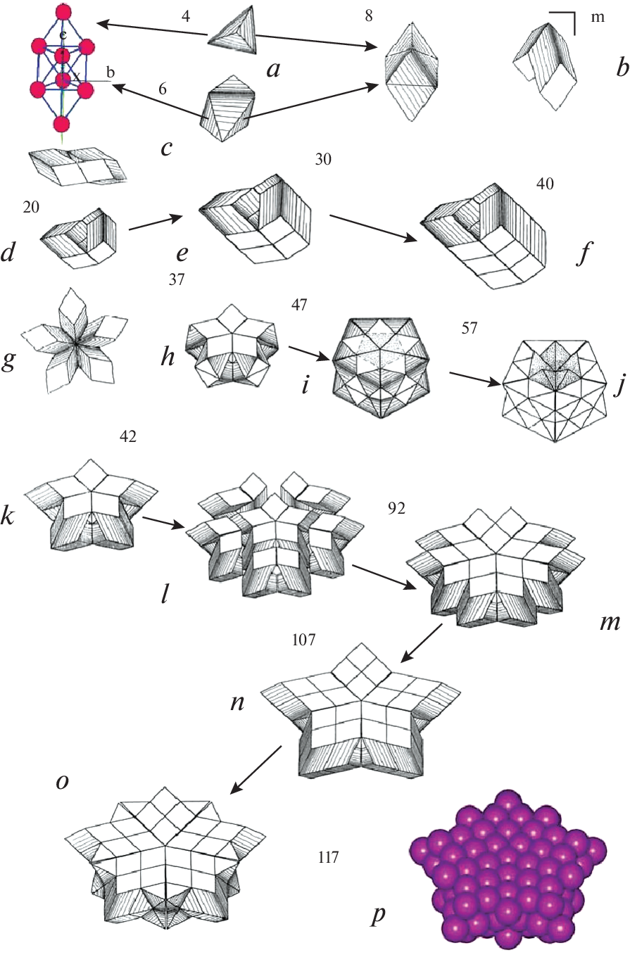The author considers the main principles of Bulienkov’s simplicial-modular design of metal clusters (face-centered cubic (FCC), body-centered cubic (BCC), hexagonal close-packed (HCP) metals). Models of clusters are presented along with algorithms for their construction based on operations of twinning (1¯1¯, 2, m) to simplices and modules of the corresponding metals.
