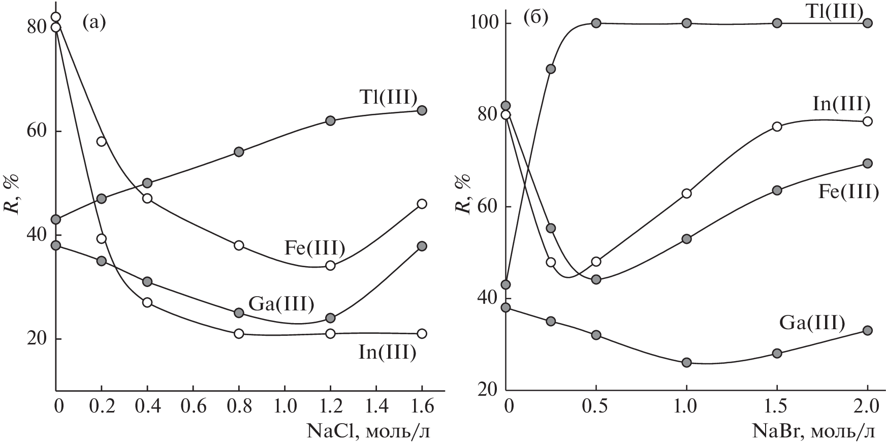 The boundaries of the segregation region in sulfuric (nitric, chloric, hydrochloric) acid–potassium bis(alkylpolyoxyethylene) phosphate–water systems at 25°С have been determined by isothermal titration. The salting-out ability of the inorganic acid was found to increase with a decrease in the absolute value of the Gibbs energy of anion hydration. Based on the obtained diagrams, the optimum parameters of extraction were determined, and tendencies in the distribution of some metal ions in the sulfuric acid–potassium bis(alkylpolyoxyethylene) phosphate–water system were studied. Conditions for quantitative extraction of thallium(III) in the presence of alkali metal halides were found.