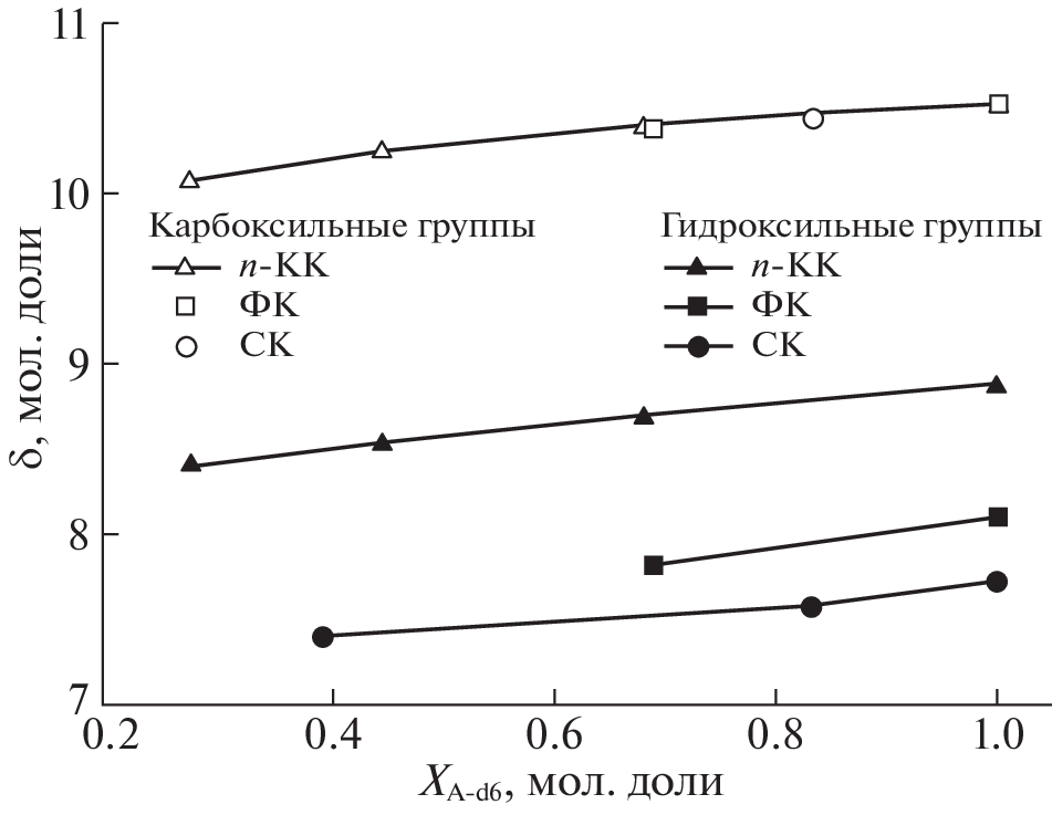 1H NMR with a pulsed magnetic field gradient method are used to measure the coefficients of self-diffusion of ferulic and sinapic acids in binary carbon tetrachloride–acetone-d6 solvent at temperatures of 278 and 298 K. Data show that the acids’ coefficients of self-diffusion grow along with the concentration of acetone-d6 and temperature. It is shown that the effective hydrodynamic radii of acids do not depend on the composition of the binary solvent within the experimental error. In light of molecular association, this behavior can be explained by the competition between two processes: acid–acetone heteroassociation and acid–acid self-association.