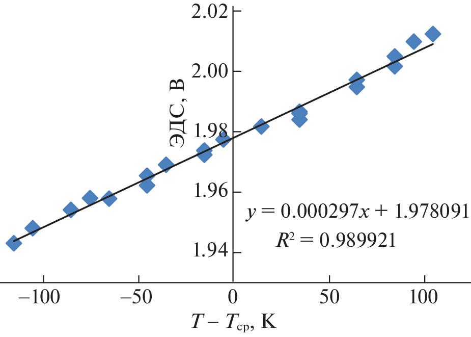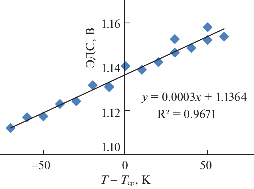 The EMF in the 473–728 K range of temperatures is measured for solid-phase galvanic cells (‒) Sm|SmCl2||BaCl2||SmCl3|Sm3Cl7 (+), (–) Sm|SmCl2||BaCl2||Sm3Cl7|SmCl2 (+), (–) SmCl2|Sm3Cl7|| BaCl2||SmCl3|Sm3Cl7 (+), and (–) Mg|MgCl2||BaCl2||SmCl3|Sm3Cl7 (+). Experimental data are processed according to the second law of thermodynamics using literature values of thermodynamic characteristics of the components of the EMF-forming reaction: Sm, Mg, SmCl2, SmCl3, and MgCl2. Values of the standard Gibbs energy of formation, the standard enthalpy of formation, and the standard entropy of chloride Sm3Cl7 at a temperature of 298.15 K are obtained by averaging data on four galvanic cells.