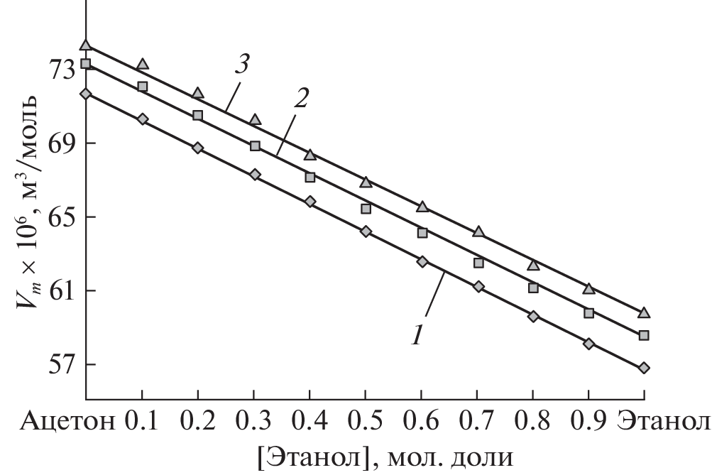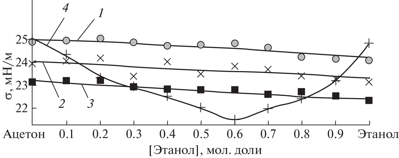Experimental data are presented on the surface tension and density of acetone (chemically pure) and ethanol (pure for analysis) and acetone–ethanol solutions of different concentrations. The temperature dependence of density is measured with a VIP-2MR vibration density meter with a systemic error of ±0.01 g/cm3. Surface tension (ST) is measured with hanging drops on a DSA-100 KRUSS tensiometer whose systemic error is no more than 1%. Experimental measurements show the concentration dependences of molar volumes and surface tension within the experimental error are described by a linear function. Calculations of the ST isotherms according to the equation of A.A. Zhukhovitsky, obtained by assuming the surface layer and bulk phase are ideal, show the theoretical ST isotherms coincide with experimental ones within the experimental error. Calculations of the thermodynamic parameters of the surface layer show the coefficients of thermodynamic activities of the components in the surface layer are close to unity throughout the range of concentrations. Based on these results and the finite thickness of layers, it is concluded that the surface layers of ethanol–acetone solutions is ideal.