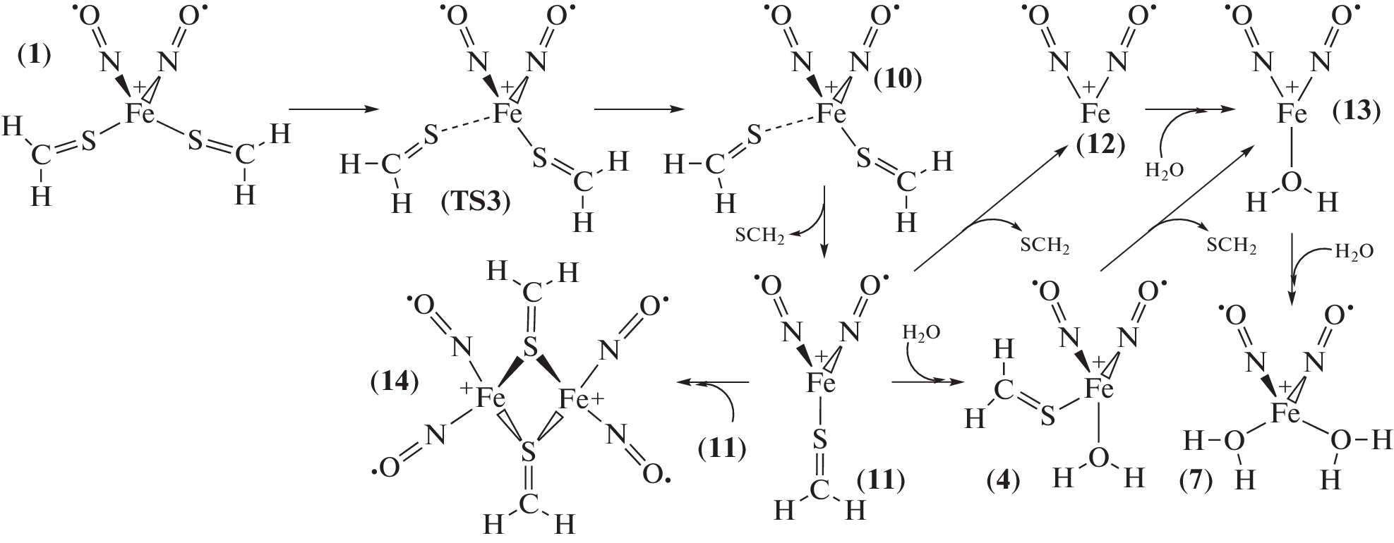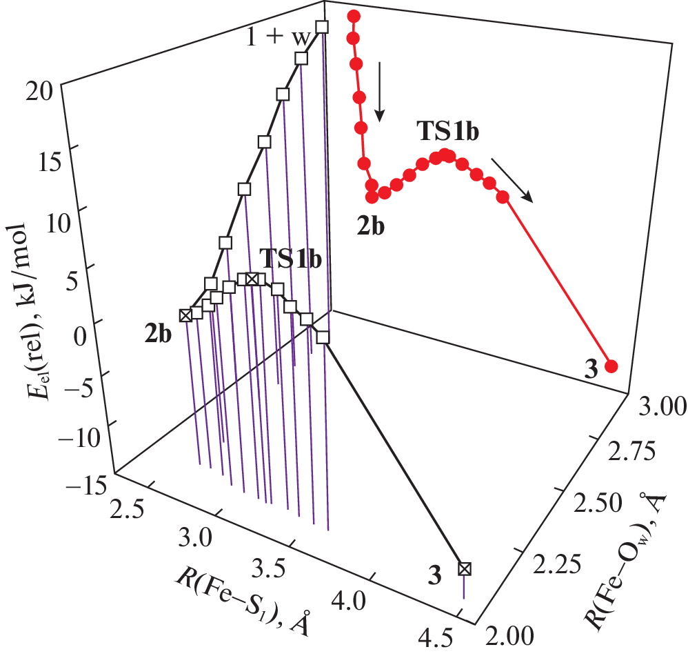 The mechanisms of hydrolysis of a model iron–sulfur–nitrosyl complex (ISNC) [Fe(NO)2(SCH2)2]+ 1 with thioformaldehyde ligands have been studied using the density functional theory and polarizable continuum model of water. Quantum chemical calculations employed the TPSSH and M06 functionals and def2-TZVP basis set and took into account interactions with water medium. Hydrolysis of 1 was found to be an exothermic process with small activation energy whereas exchange of NO for H2O is thermodynamically unfavorable. The calculations have predicted lower activation barrier for the associative mechanism with concerted replacement of SCH2 by H2O than for dissociative mechanism with homolytic bond cleavage of the Fe–S coordination bond in water. The mechanism of hydrolysis that involves participation of OH– was found to be less probable at pH 7. The calculation results show that ISNC 1 is of {Fe1+(NO•)2}9 type and retains its tetrahedral structure that is typical for crystals of ISNC with thiocarbonyl ligands.