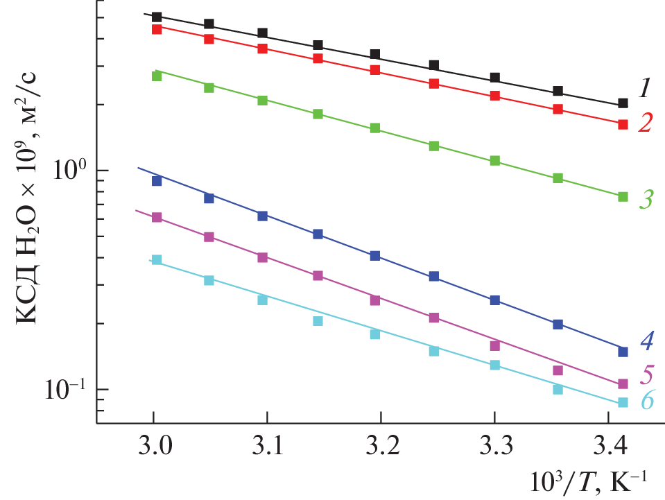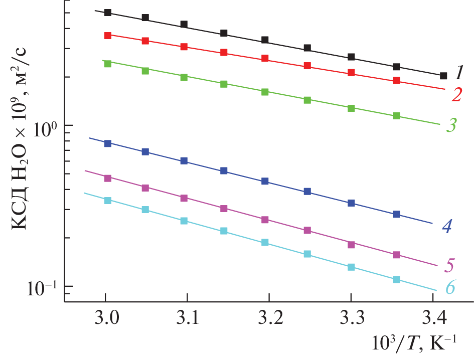 Self-diffusion coefficients (SDCs) of 3-amino-1-propanol (3AP), monoethanolamine (MEA), and water molecules are measured via 1H NMR using a pulsed magnetic field gradient and a stimulated echo sequence throughout a range of concentrations at temperatures of 293–333 K. It is found that the studied amino alcohols and water form a nearly tetrahedral three-dimensional network of hydrogen bonds between the molecules of the system. It is shown that this network is stable in the liquid phase, despite the mobility of the molecules that constitute the network. The mechanism of molecular mobility is studied. It is shown that the SDC of the molecules of the above amino alcohols and their aqueous solutions depends linearly on temperature. It is concluded that the molecular mobility mechanism has a pattern of activation. To verify this hypothesis and interpret the mechanism, the energies of activation are calculated for the self-diffusion of all the studied molecules in water–amino alcohol systems. The determined energies of activation for the mobility of amino alcohol molecules in aqueous systems have similar values, suggesting they undergo interactions that produce either mixed water–amino alcohol spatial networks or amino alcohol–water molecule associations in the liquid phase.