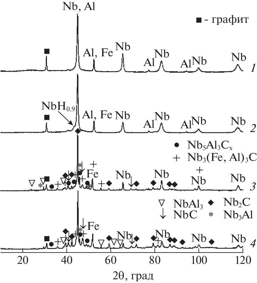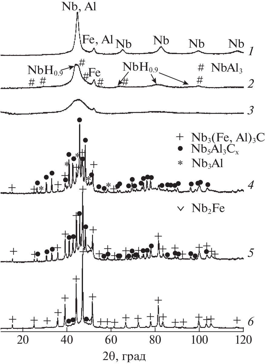 The η-carbide Nb3(Fe,Al)3C phase was synthesized for the first time by mechanical alloying of Nb, Al, and Fe in petroleum ether followed by annealing. The synthesis of carbide occurs due to carbon accumulated from the grinding medium. If mechanical alloying is performed using steel vials and balls, the composites based on η-carbide can be obtained without additional introduction of iron; contaminant iron is involved in the formation of Nb3(Fe,Al)3C.