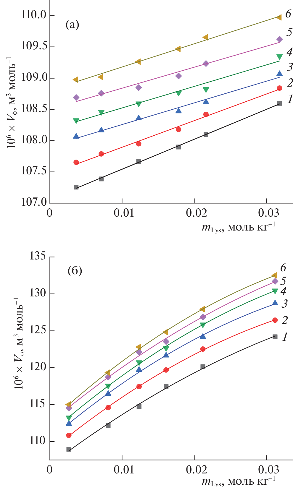 The behavior of L-lysine (Lys) in water and an aqueous buffer solution is studied by densimetry as the temperature varies from 288.15 to 313.15 K with an interval of 5 K. Based on the experimental density values of amino-acid solutions, the apparent molar volumes and partial molar volumes of Lys are determined at an infinite dilution in water and buffer solution at each temperature. The effects of temperature, medium, and amino-acid concentration on volumetric characteristics are revealed. The partial molar extensibility and their derivatives with respect to temperature, the values of which indicate the structurally destructive behavior of Lys in the studied solutions, are determined. It is found that the structurally destructive effects of Lys are enhanced in an aqueous buffer solution. It is shown that the partial molar volumes of amino-acid transfer from water to the buffer solution have positive values in the studied temperature range. The results obtained are discussed on the basis of various types of molecular interactions between a solute and a solvent using the Gurney model.