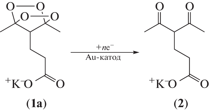 The behavior of a smooth gold electrode in aqueous solutions of the potassium salt of bridging 1,2,4,5-tetraoxane containing a biperoxide cyclic fragment was studied by cyclic voltammetry. The cathode process was analyzed in detail. It was shown that the process involves four electrons. The products of electrolysis of the potassium salt were studied, and a reaction mechanism was proposed.