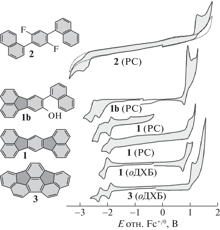Acenaphtho[1,2-k]fluoranthene (1) is synthesized via tandem cyclization during the dehydrofluorination of 1,4-di(1-naphthyl)-2,5-difluorobenzene (2) on activated γ-Al2O3. Presence of residual hydroxyl groups in alumina reduce the yield of target product 1 because of the side hydrolysis of fluoroarenes with the formation a product of partial cyclization, 9-(1-naphthyl)fluoranthen-8-ol (1b). The formation of negative ions (NI) of compounds 1 and 2 in the gas phase is studied by means of dissociative electron attachment (DEA) spectroscopy. Long-lived molecular NIs 1 and 2 are registered at the thermal energies of electrons, and patterns of their fragmentation are established. The adiabatic electron affinities of compounds 1 and 2 are estimated in the Arrhenius approximation and equal 1.17 ± 0.12 and 0.71 ± 0.07 eV, respectively, which agree with data from quantum chemical modeling at the level of the density functional theory (DFT). Electronic transitions for compounds 1 and 2 are studied via optical absorption and fluorescence spectroscopy. Fluorescence quantum yields are measured, and the resulting data are interpreted according to the time dependent DFT. The electrochemical properties of compounds 1, 1b, and 2 are studied via cyclic voltamperometry, and the levels of boundary molecular orbitals are estimated on the basis of their formal potentials of reduction and oxidation.