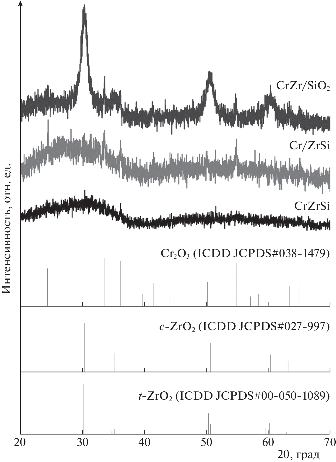 A comparison is made of CrOx–ZrO2–SiO2 catalysts (9 wt % chromium oxide based on Cr2O3); (Cr + Zr)/Si molar ratio of 0.8) synthesized using different orders of introducing components: (i) the simultaneous precipitation of all components, (ii) the deposition of CrOx on ZrO2–SiO2 via impregnation, and (iii) the co-precipitation of CrOx and ZrO2 on SiO2. The SiO2 precursors are TEOS in methods (i) and (ii), and SiO2 produced by calcination of rice husk in (iii). The catalysts are tested in the nonoxidative dehydrogenation of propane in a flow system with a fixed catalyst bed at 500–600°С. The co-precipitation of CrOx and ZrO2 ensures high efficiency of the catalysts. At 500 and 550°C, the most efficient catalyst is CrZr/SiO2 synthesized by depositing CrOx and ZrO2 on SiO2; at 600°C, the best on-stream behavior is exhibited by CrZrSi catalyst synthesized via the simultaneous precipitation of all components. SEM/EDX, XRD, H2-TPR, and Raman spectroscopy are used to show that in the catalysts synthesized via the co-precipitation of CrOx and ZrO2, these components (which form active sites) are uniformly distributed, have close contact, and are adequately dispersed, while Cr6+ is readily reduced to Cr3+ by the hydrogen contained in the reaction medium.