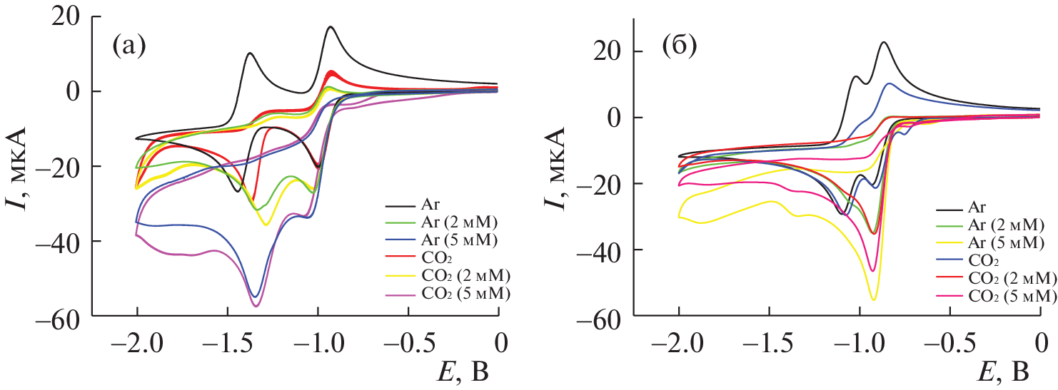 A study is performed of the electrocatalytic activity of substituted pyridine salts (N-hydro-, N‑methyl-, and N-phenyl-2,4,6-triphenylpyridinium perchlorates) in the electroreduction of carbon dioxide to carbon monoxide. The effect the natures of the substituent and the H+ source have on the efficiency of the process is determined. The main reasons for the occurrence of the electrocatalytic process are identified, and the values of TOF (catalyst speed) and TON (number of revolutions of the catalyst) are calculated. It is shown that the values of TOF and TON fall as the pK of the acid rises.