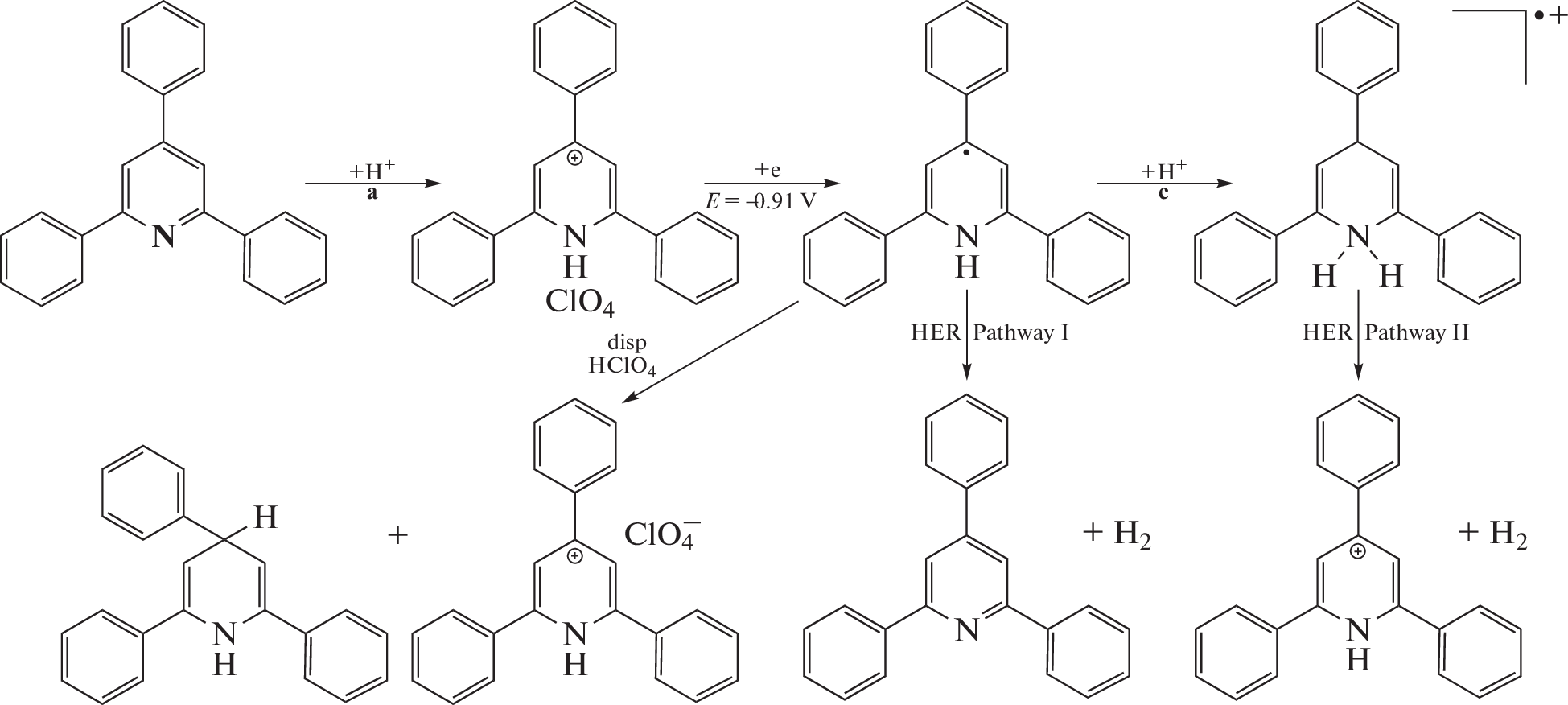 Studying the Mechanism of the Electrocatalyic Reaction for Producing Molecular Hydrogen Using the N-Methyl-2,4,6-triphenylpyridinyl Cation According to DFT